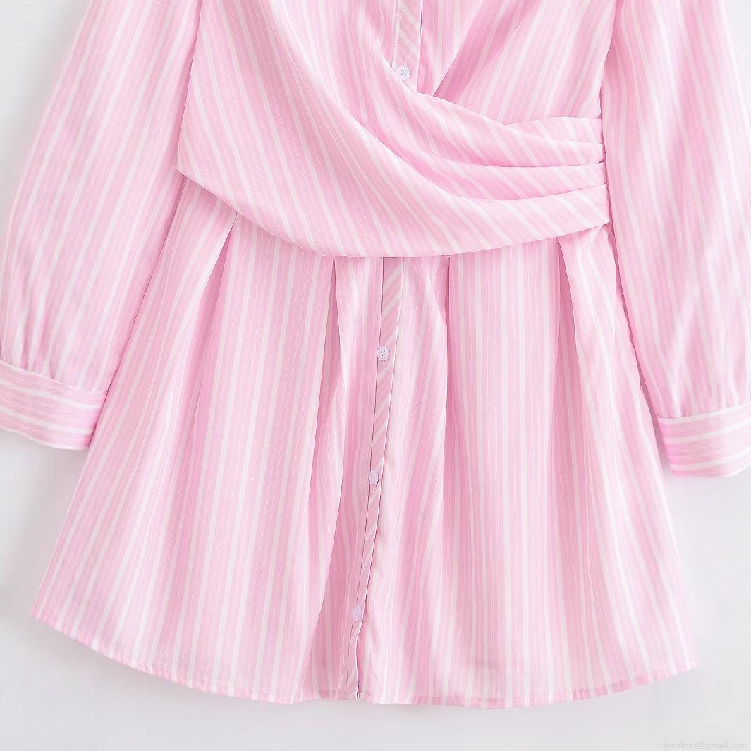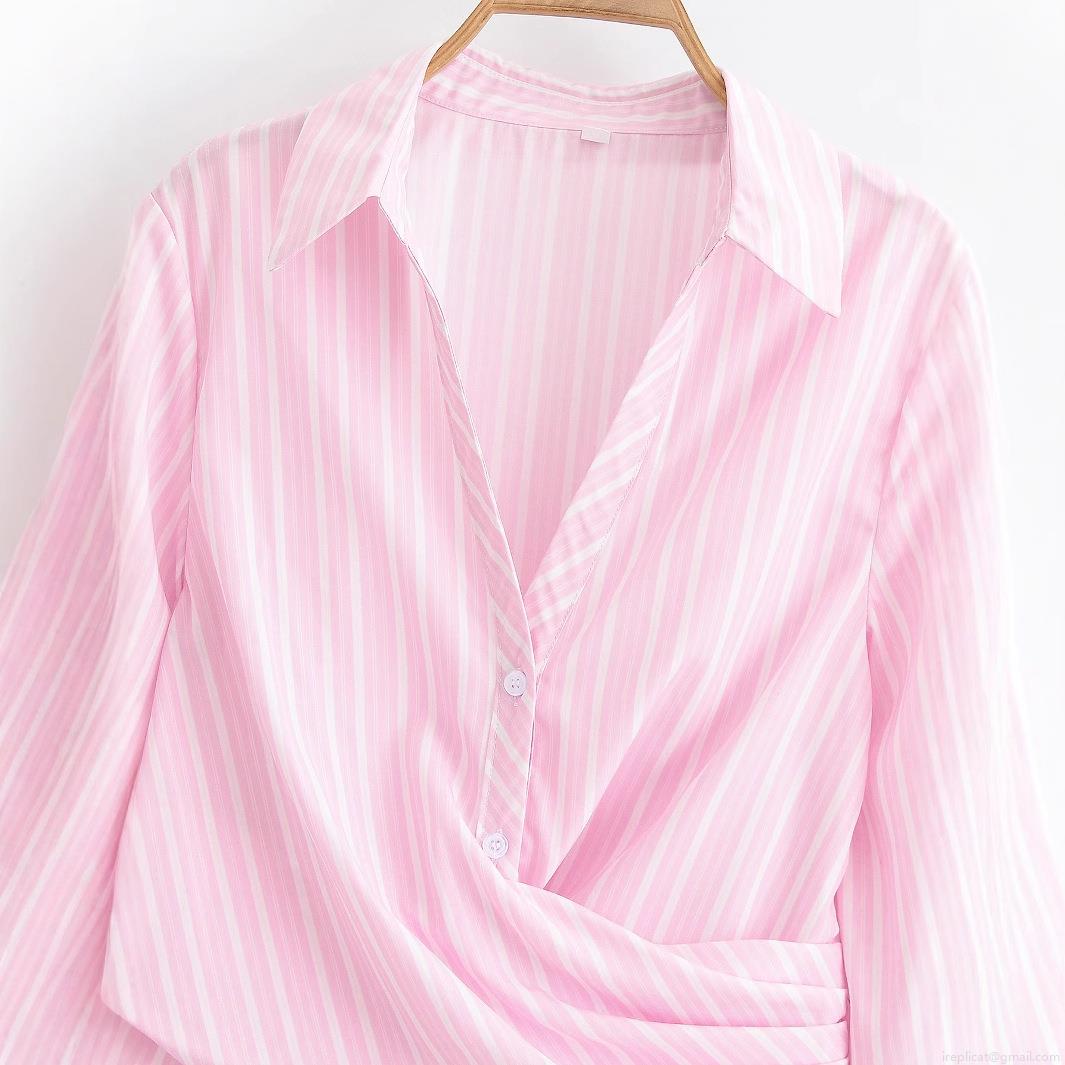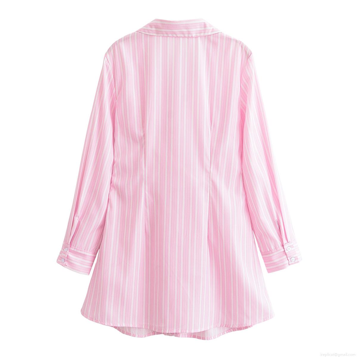 • Women's Striped V-Neck Long Sleeve Midi Dress Elegant Polyester Pink White Stripe Shirt Dress With Waist Twist Knot Detail For Casual Office Party Fashion