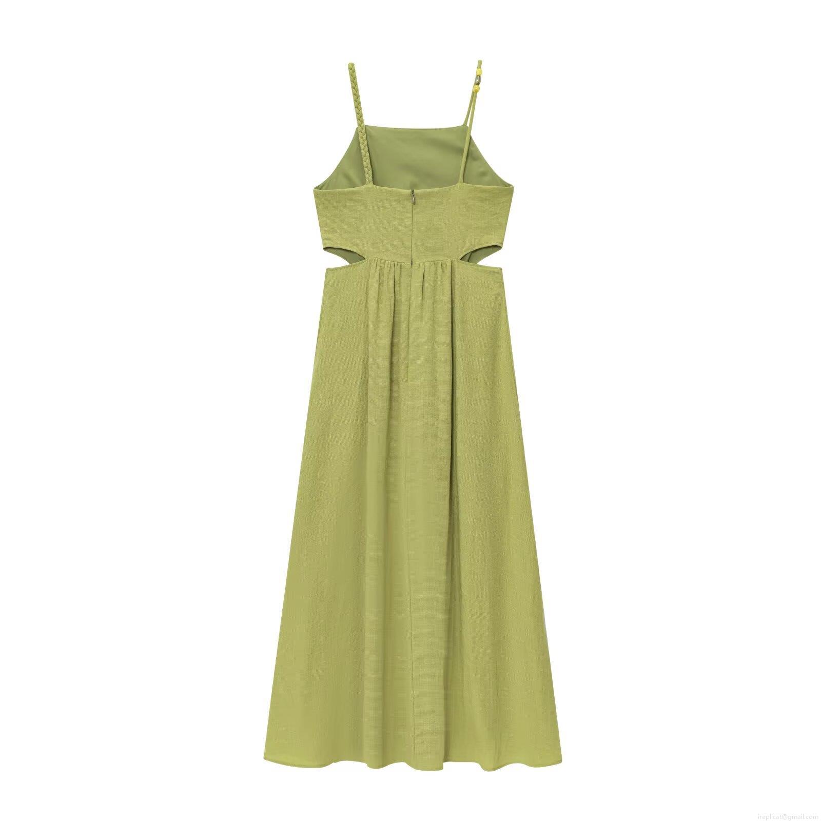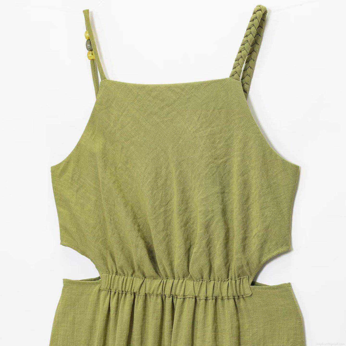 • Women's Summer Cami Dress Linen-Like Fabric Side Hollow Out Beaded Spaghetti Strap A-Line Midi Dress Sexy Backless Vacation Beach Party Solid Color Grass Green Elegant Outfits