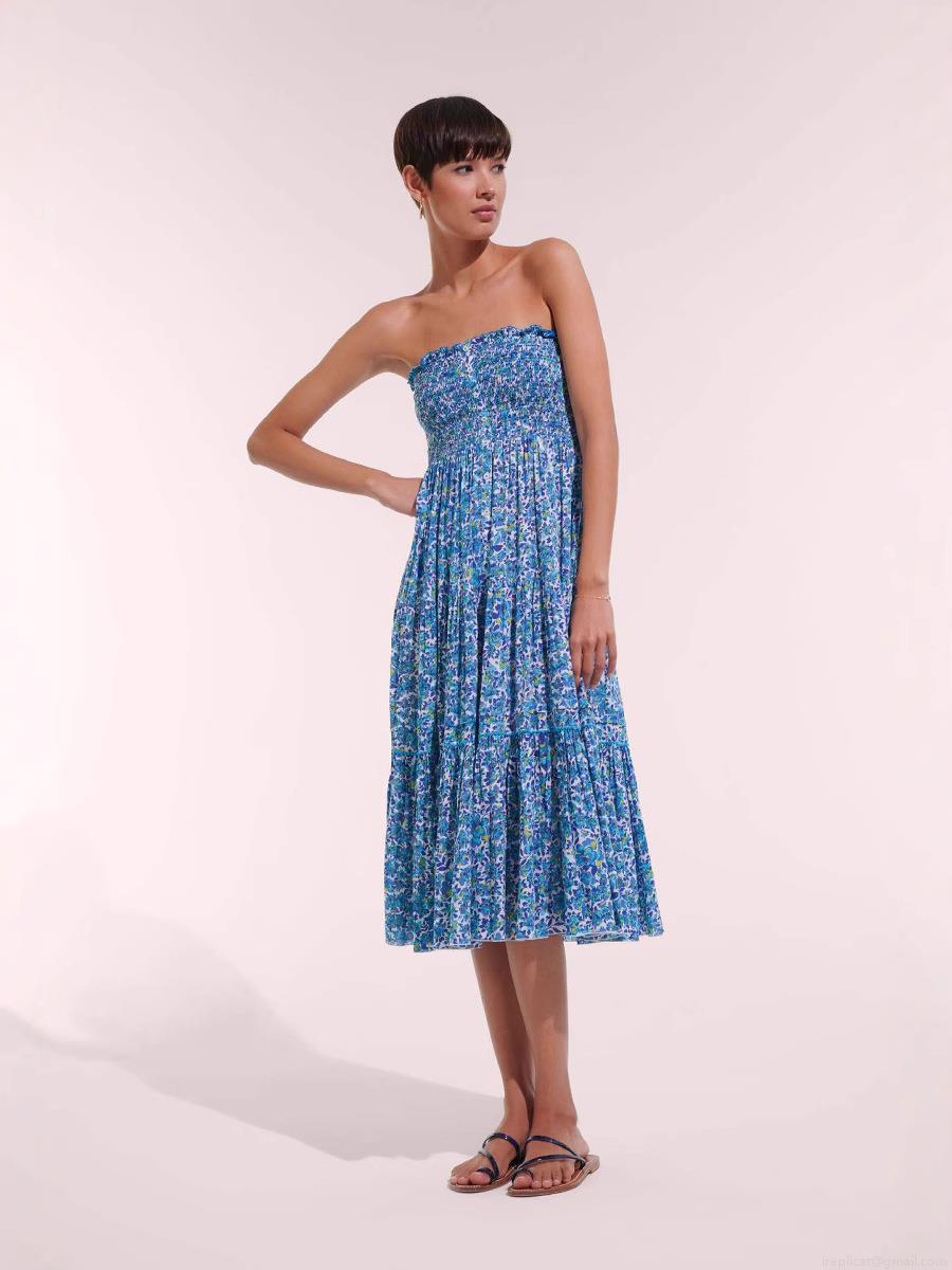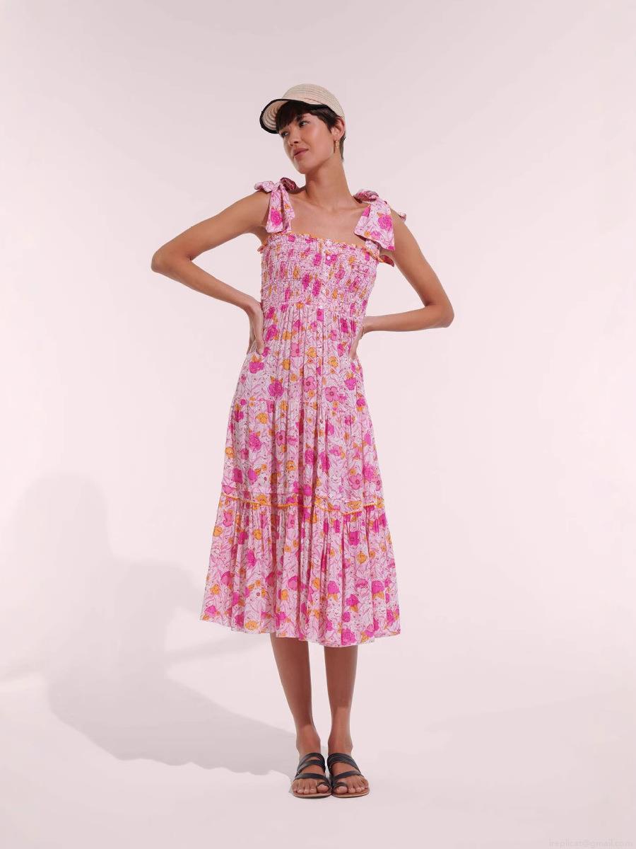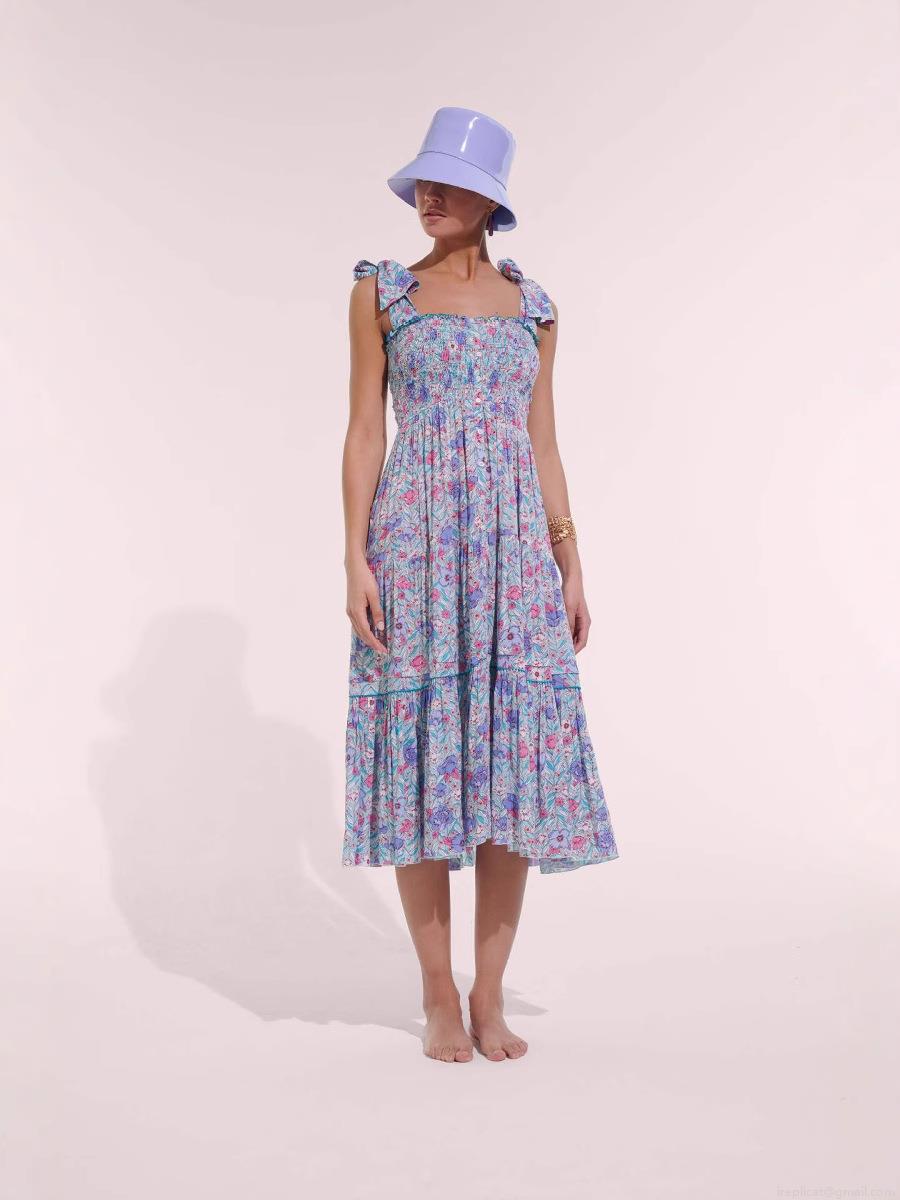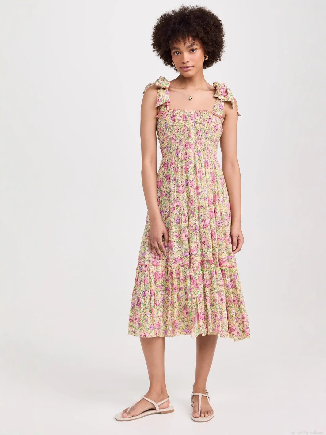 • Women's Summer Floral Print Smocked Bodice Tiered Midi Dress Sexy Backless Bow Tie Straps Ruffle Cake Hem Beach Vacation Sundress