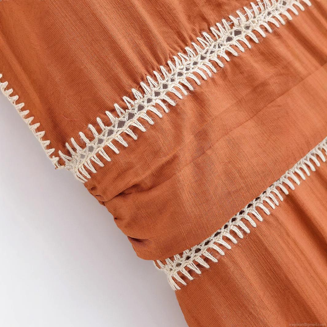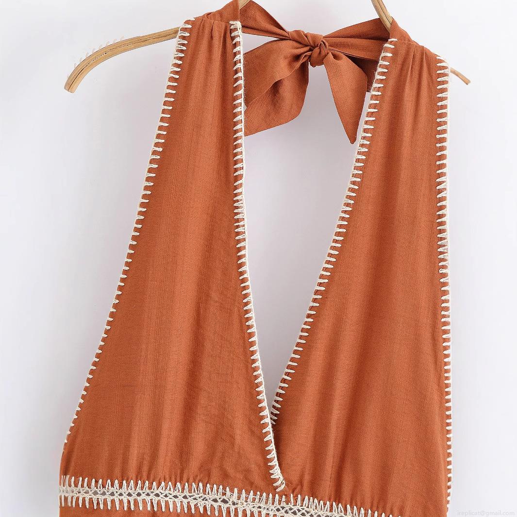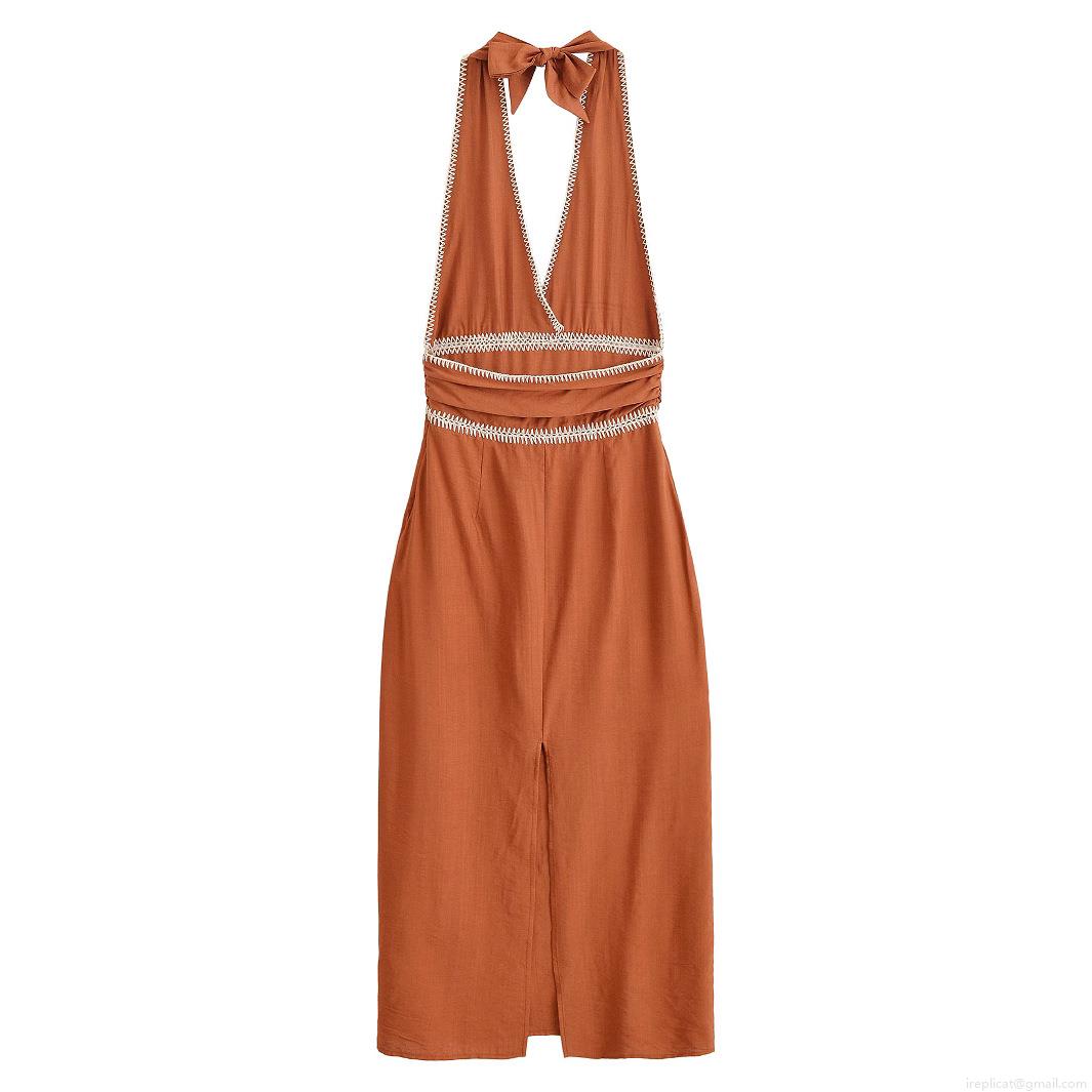 • Women's Summer Halter Neck Backless Midi Dress With Embroidery V-Neck Slit Polyester Caramel Rust Red Street Style Dress