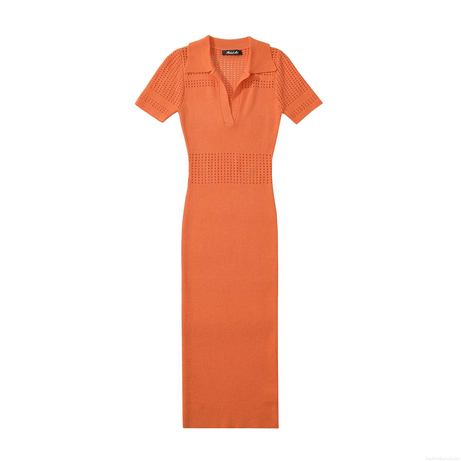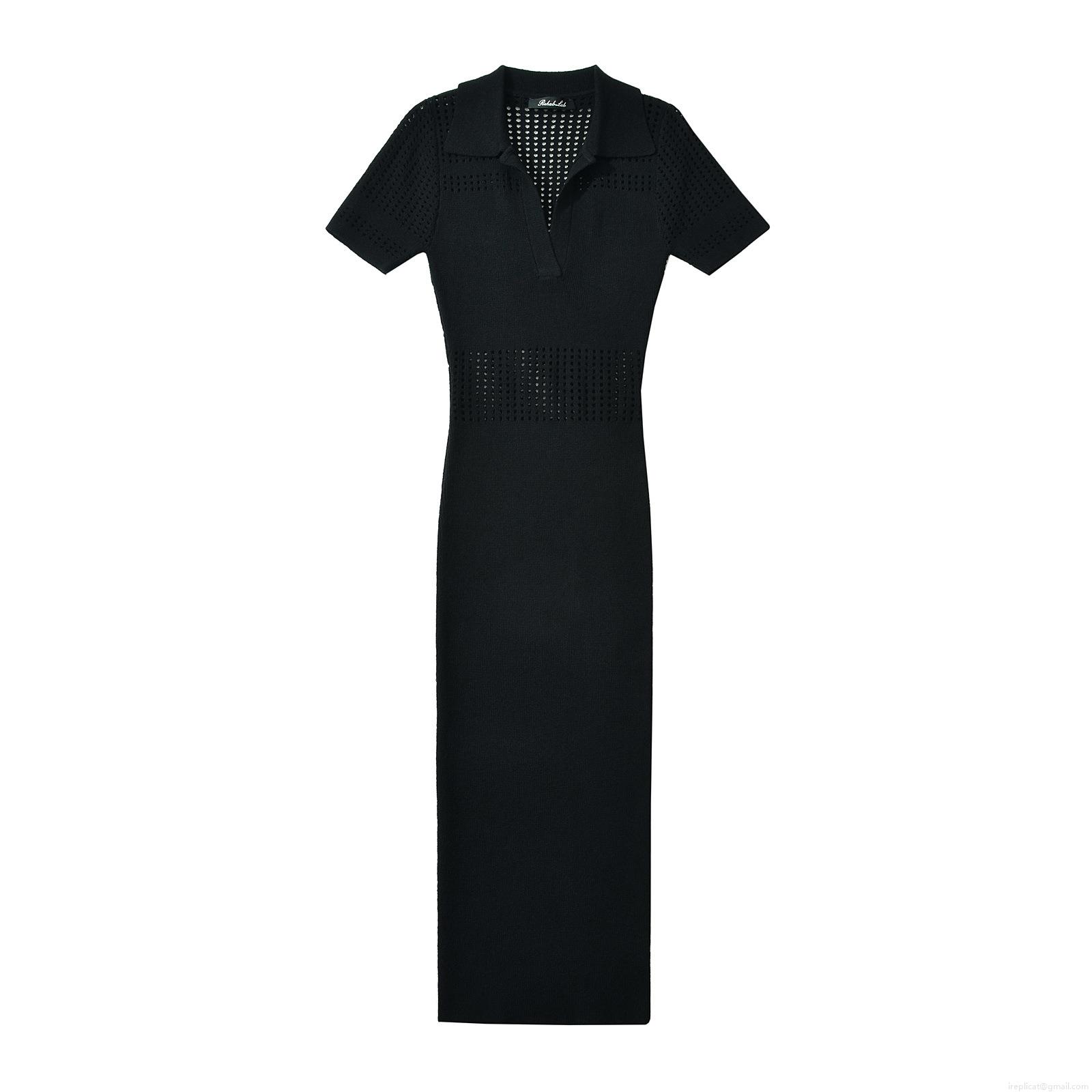 Women's Summer Knit Midi Dress Short Sleeve Polo Collar Hollow Out Bodycon Solid Color Streetwear Sexy Lapel Knit Dress