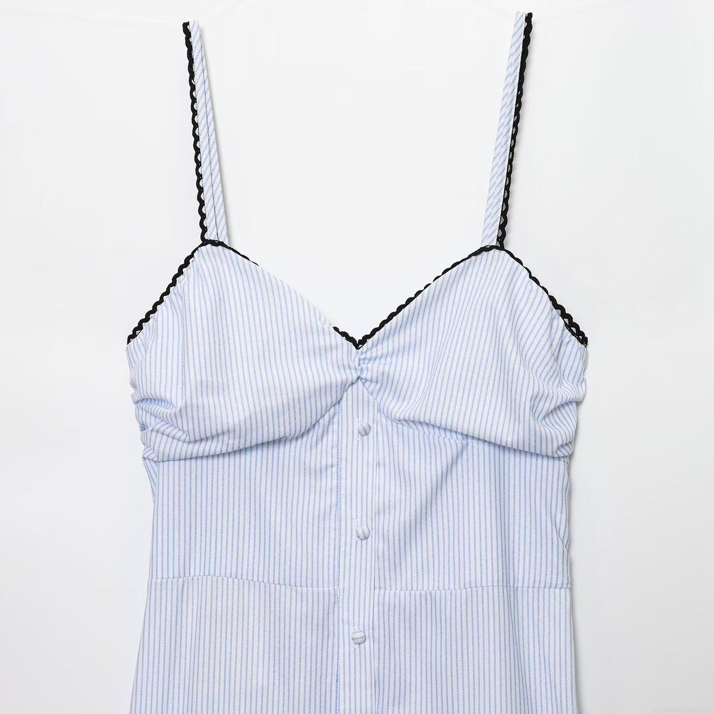 Women's Summer Light Blue White Striped Midi Dress Sleeveless Camisole A-Line Ruffle Tiered Sundress With Black Lace Trim For Casual Vacation