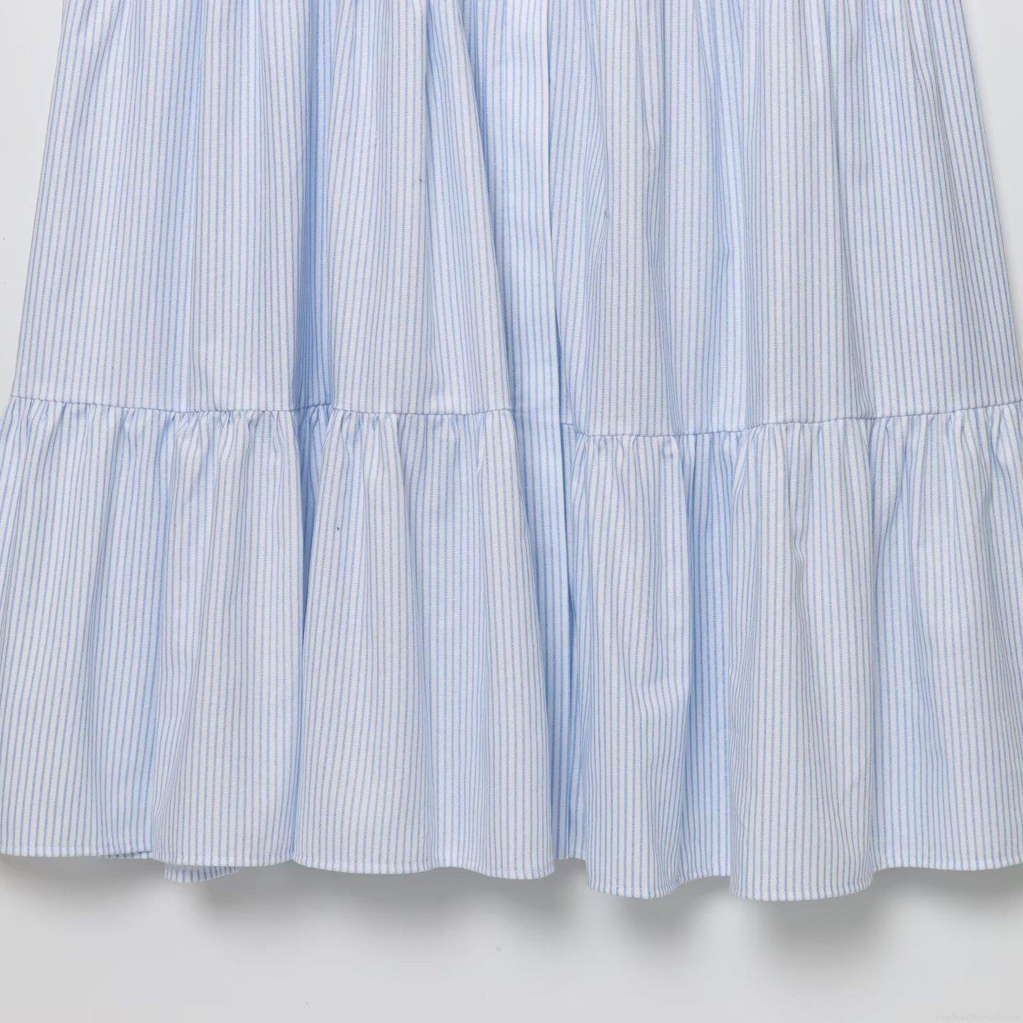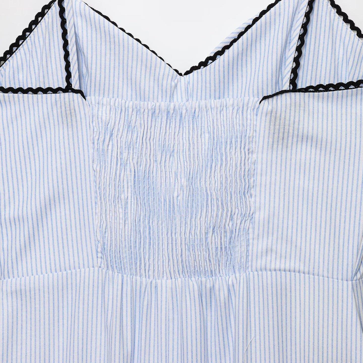 • Women's Summer Light Blue White Striped Midi Dress Sleeveless Camisole A-Line Ruffle Tiered Sundress With Black Lace Trim For Casual Vacation