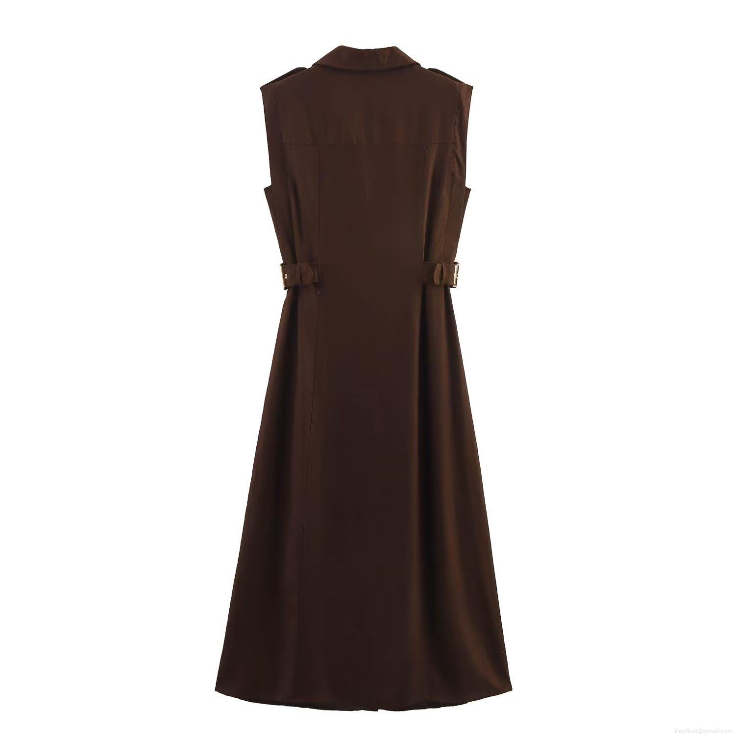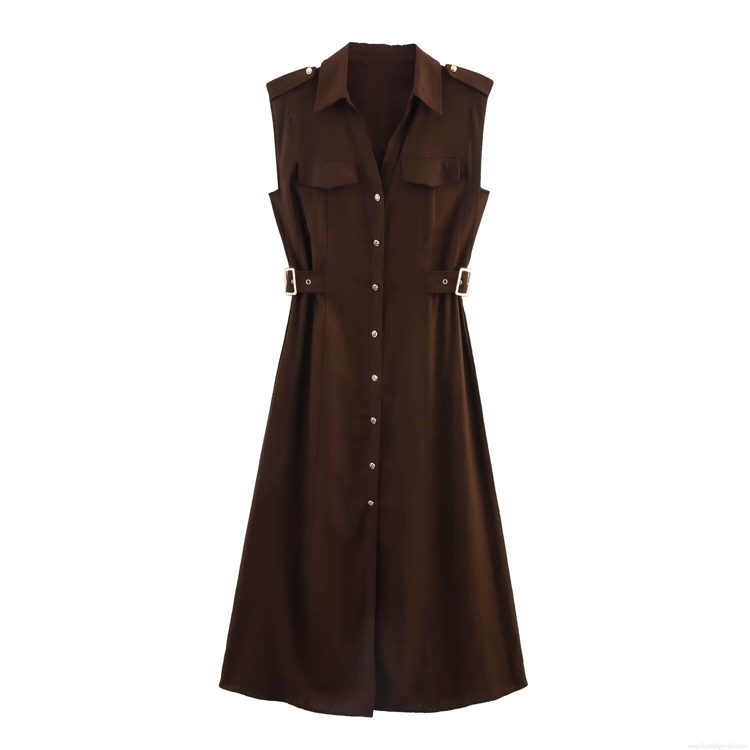 • Women's Summer Sleeveless Shirt Dress European Single Breasted Waist Cinching Midi Dress With Belt Epaulets Flap Pockets Turn-down Collar Solid Color Casual Streetwear Office Lady Dress