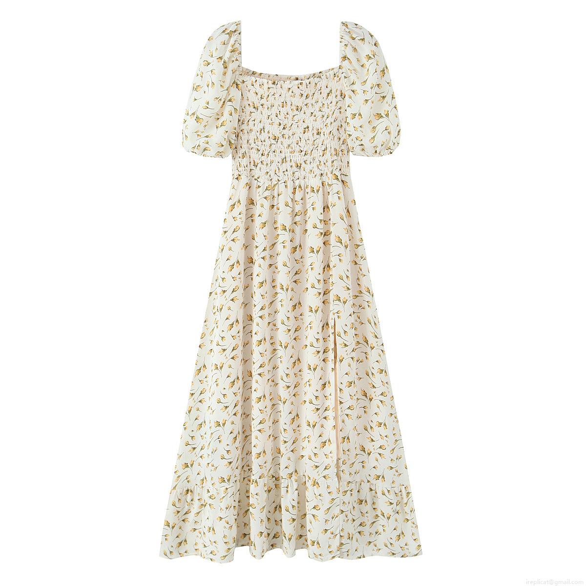 • Women's Summer Vintage Floral Square Neck Puff Sleeve Smocked Midi Dress With Split A-Line Cottagecore Style Summer Dress