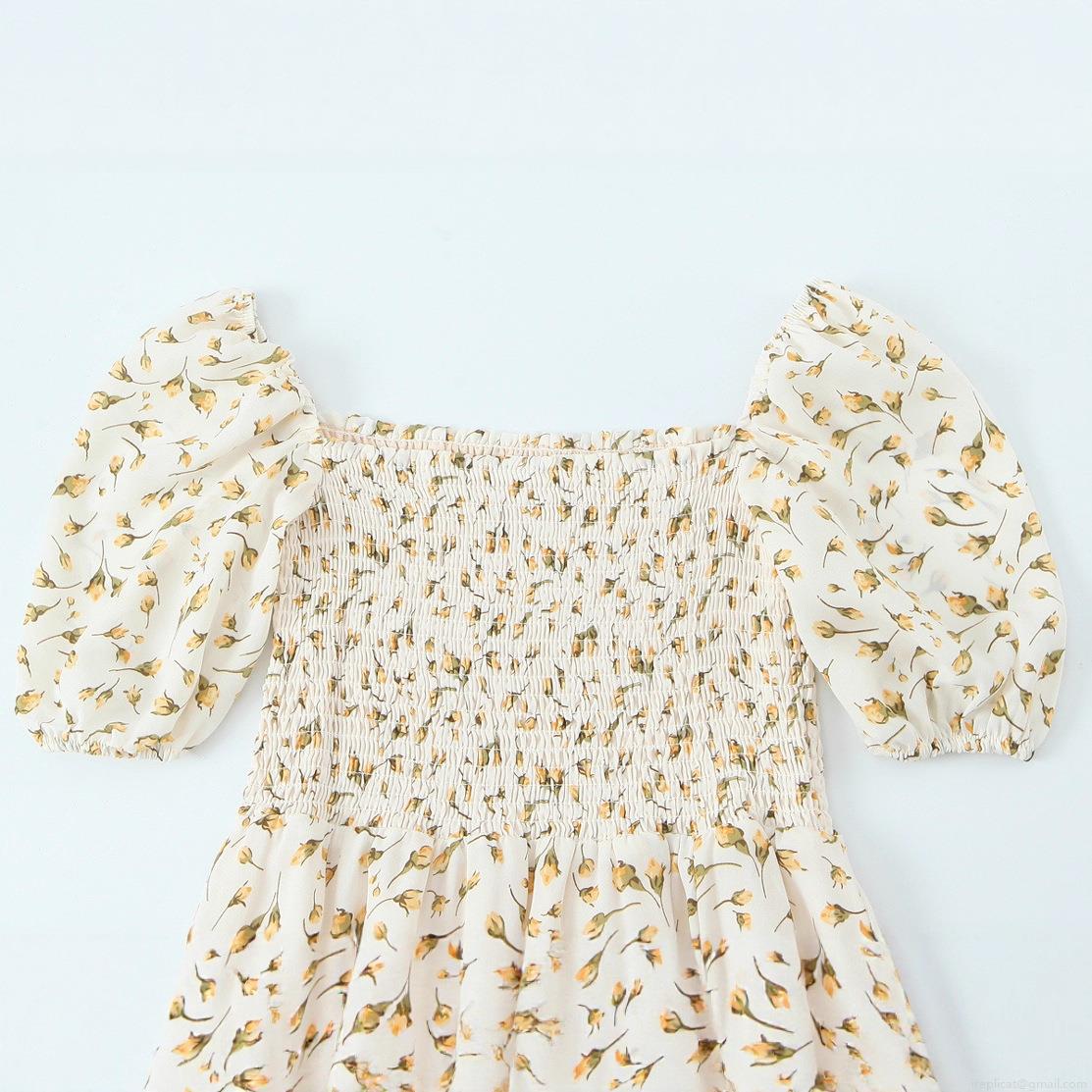 Floral Pattern, Puff Sleeves, Square Collar, Split Design, Bundling Process, Yellow Roses In Floral Pattern