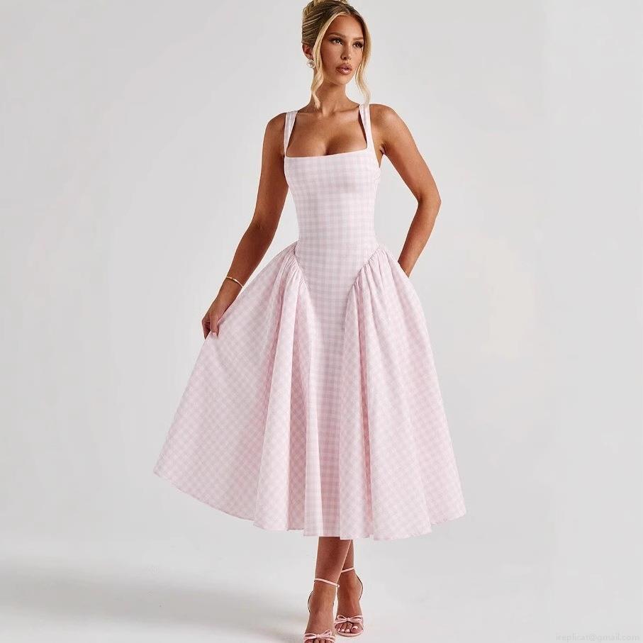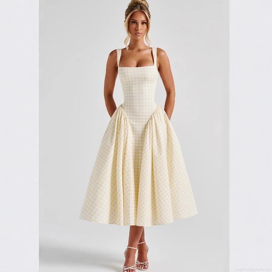 • Women's Sweet Gingham Plaid Midi Dress Square Neck Sleeveless Backless Tie Up High Waist A-Line Puffy Long Dress For Summer Vacation Party