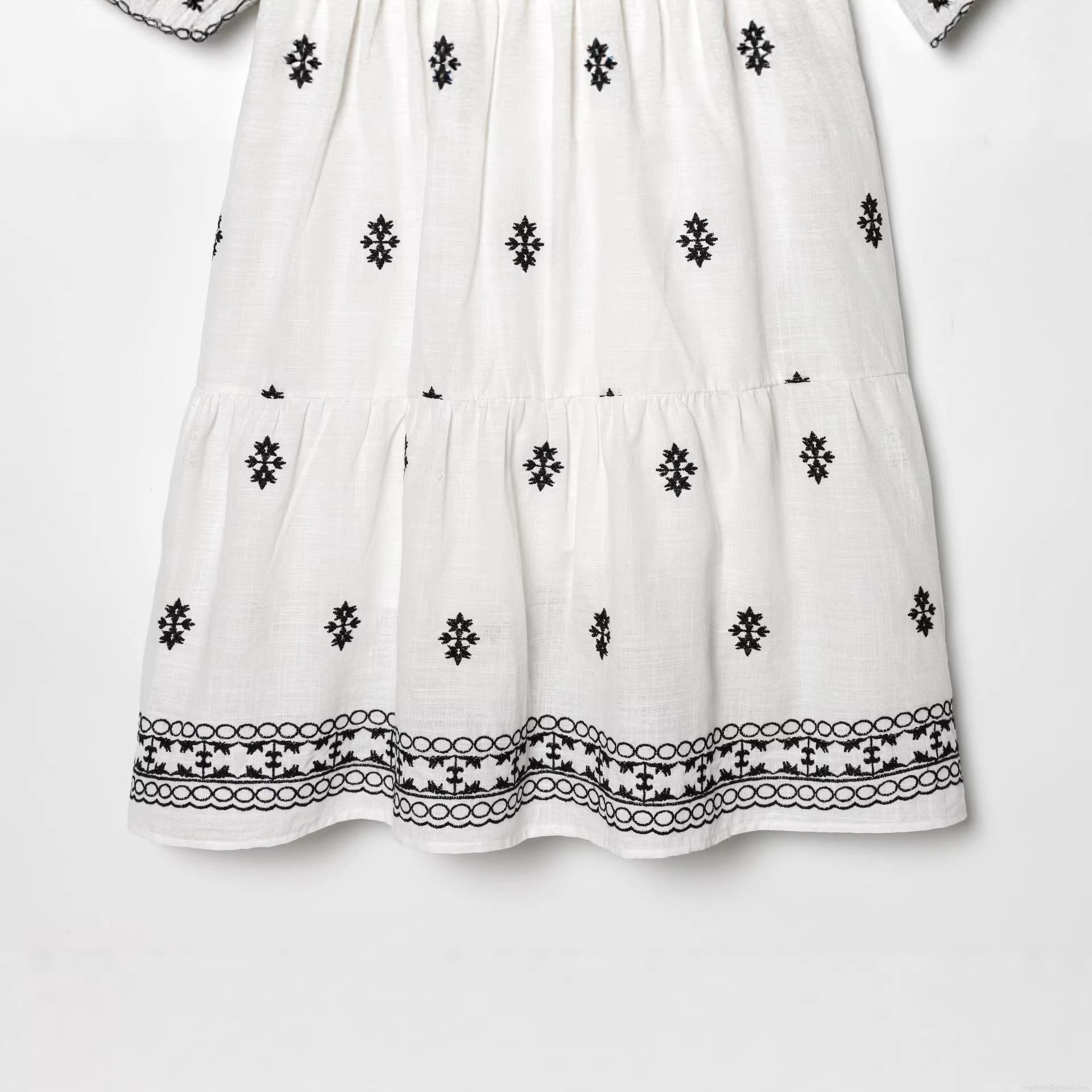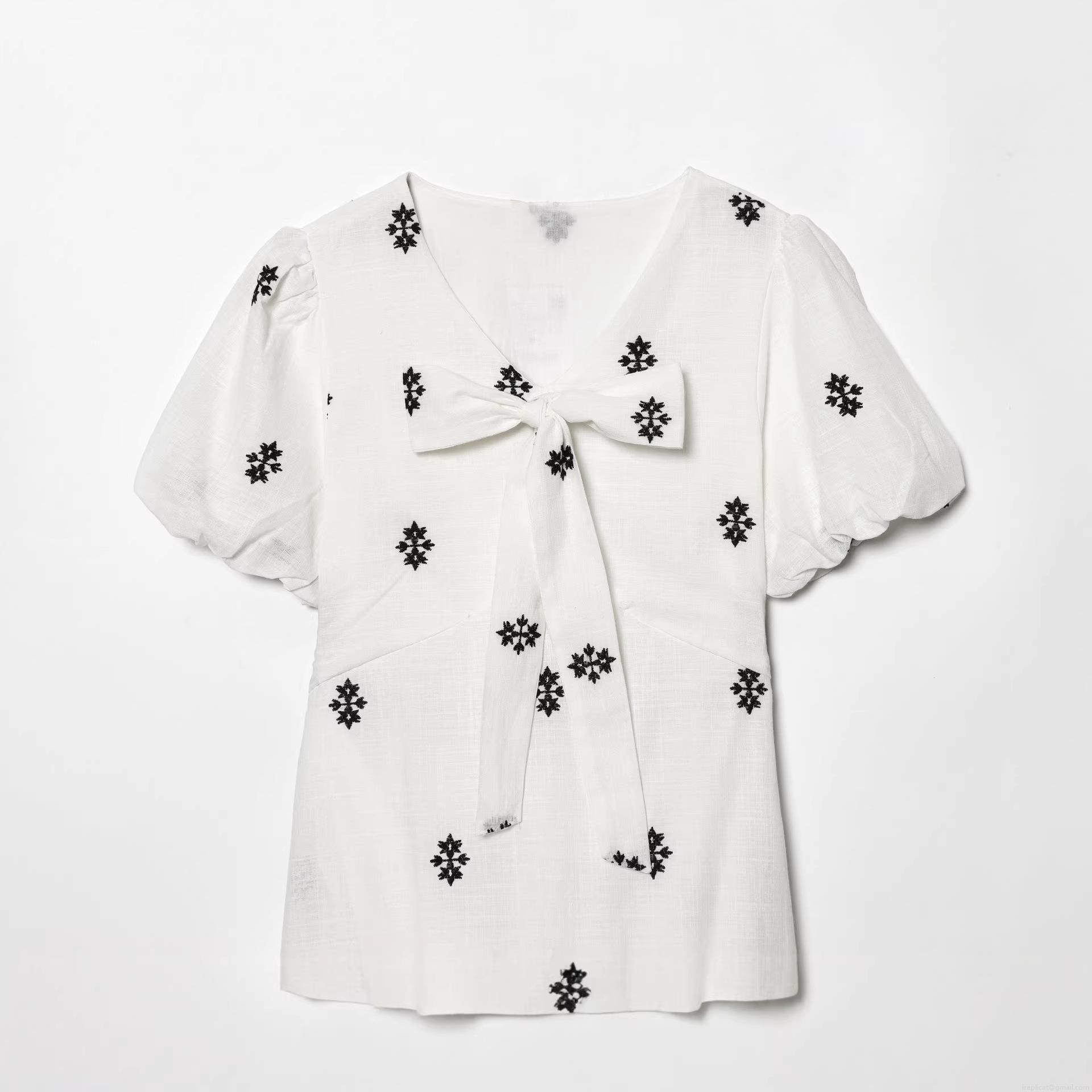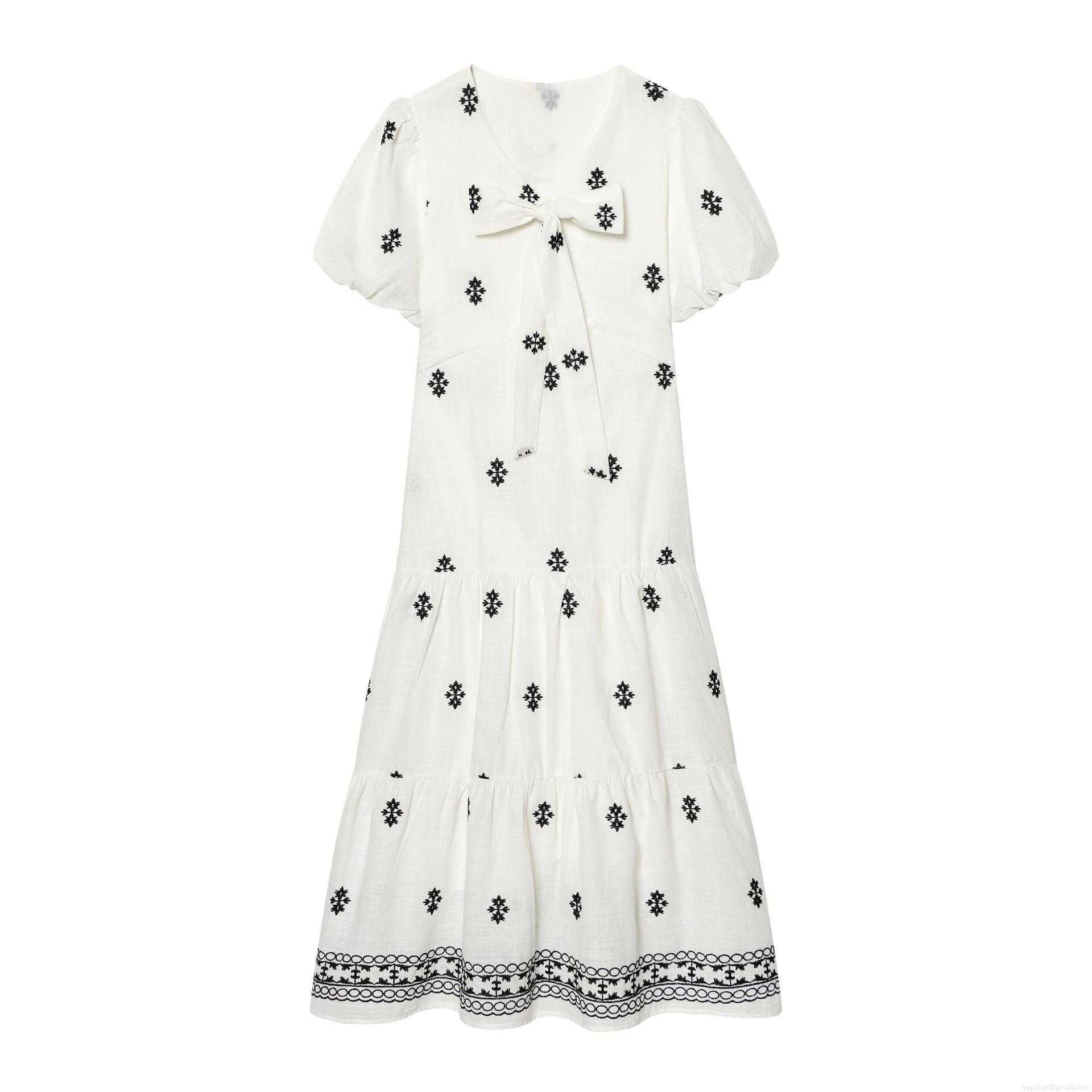 Bow, Embroidery, V-neck, Gathering, Puff Sleeves, Cake Skirt, Geometric Flowers, Multi-layer Splicing