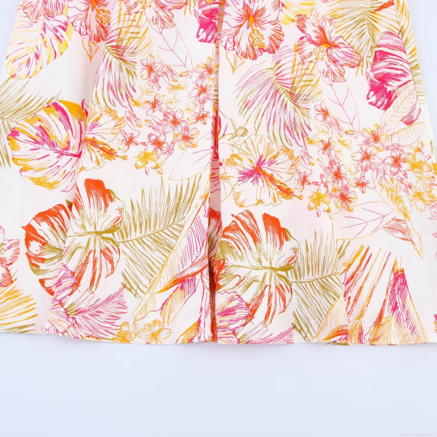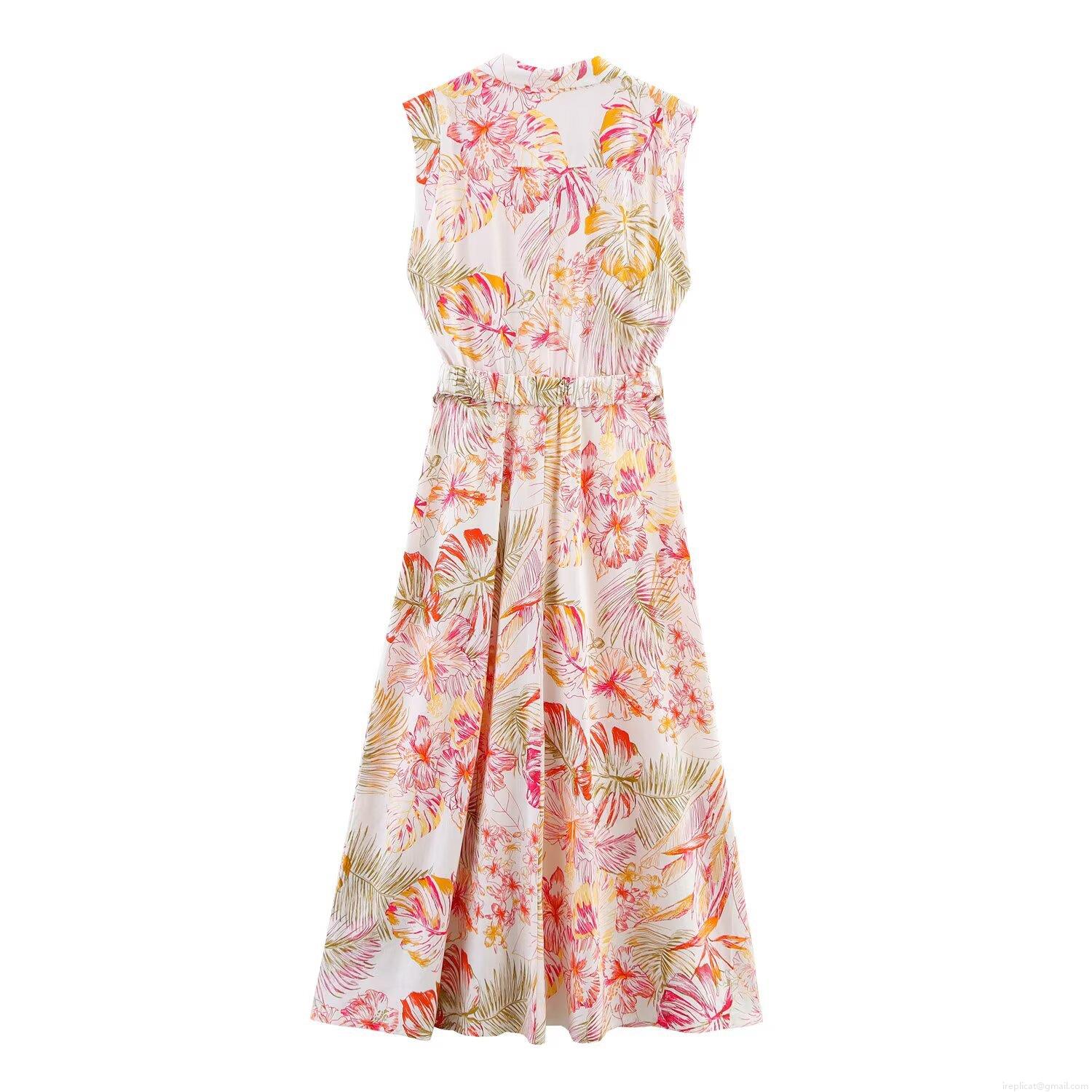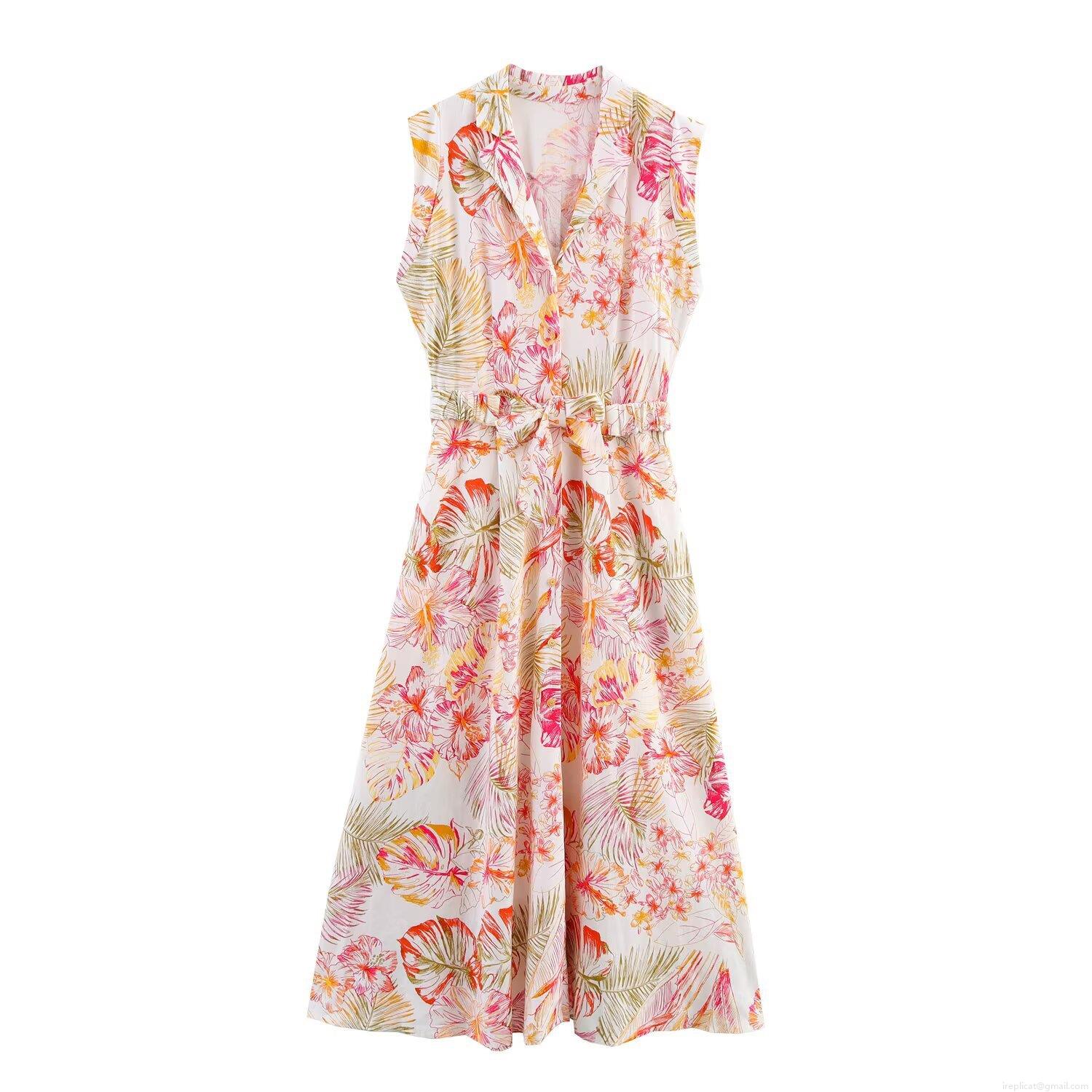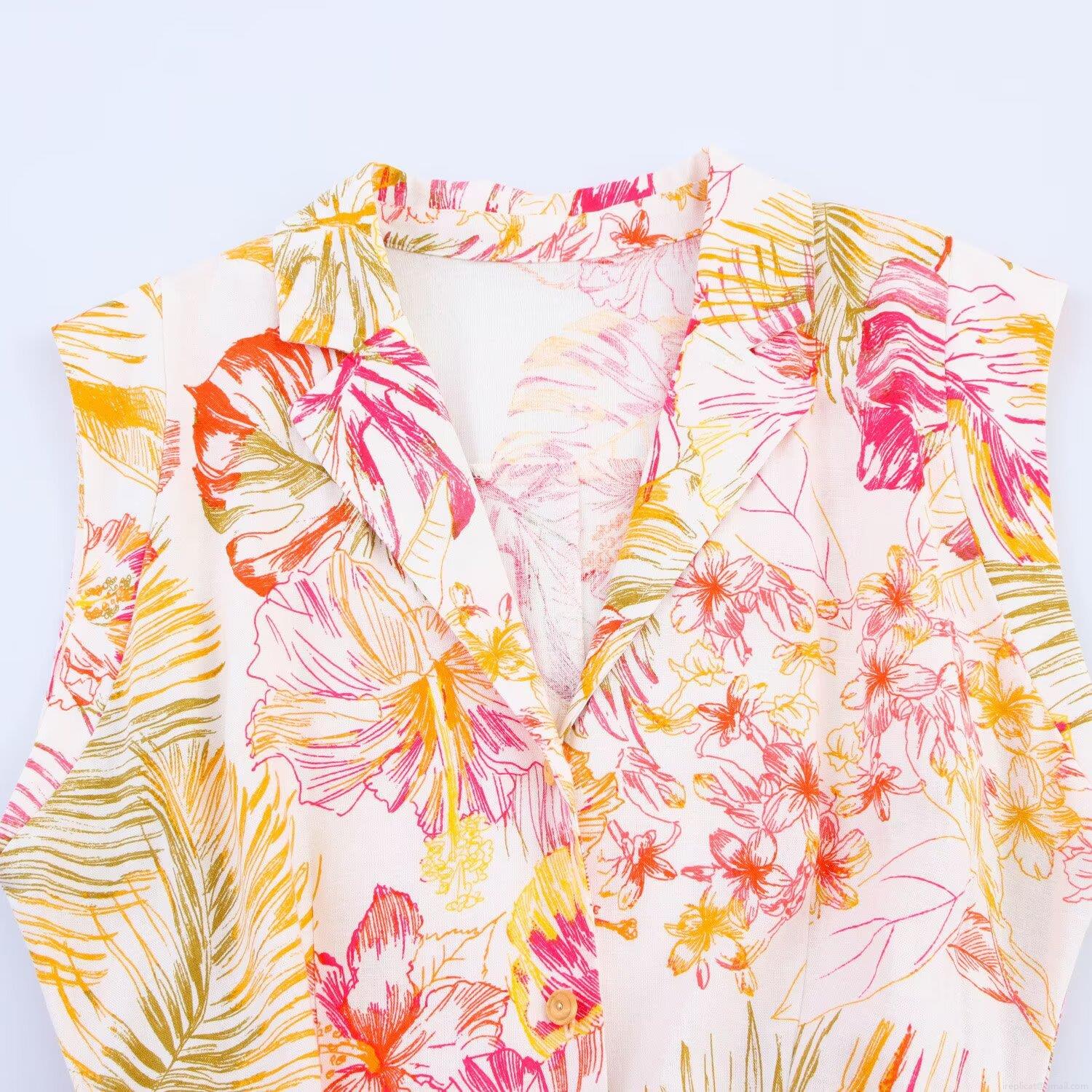 • Women's Tropical Floral Print Linen Blend Midi Dress Sleeveless V-Neck Button Down A-Line Long Dress With Belt For Summer Vacation Elegant Sundress