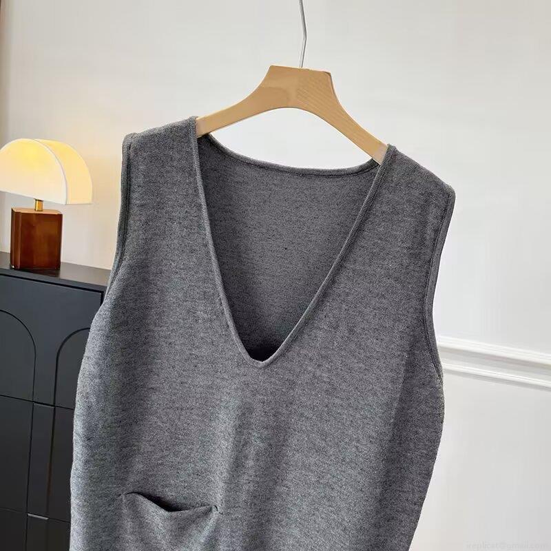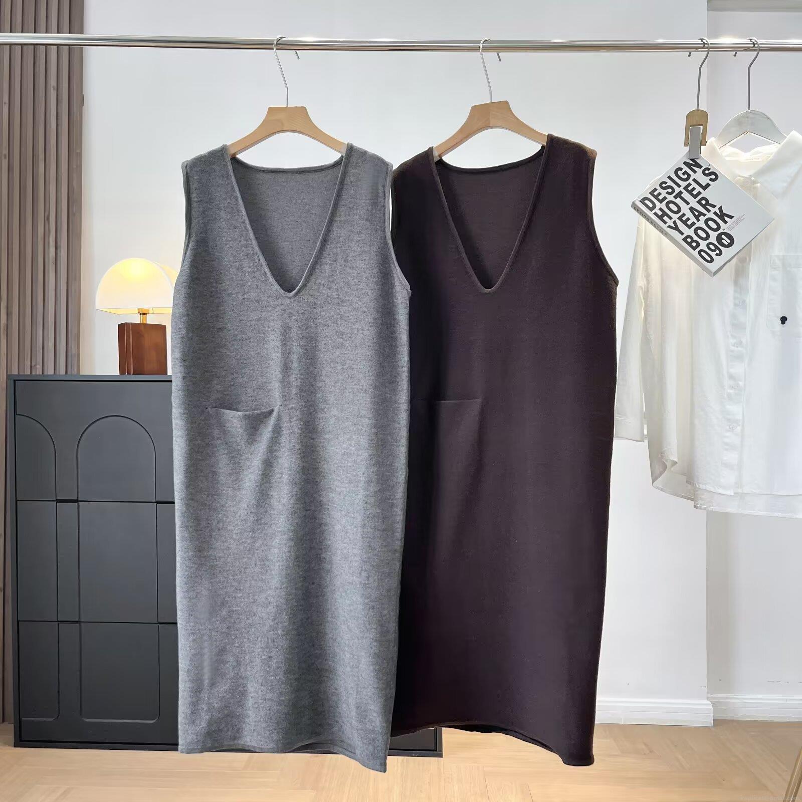 • Women's V Neck Sleeveless Knit Midi Dress Minimalist Solid Color Casual Straight Vest Dress With Pockets Autumn Pullover Fashion Knitwear