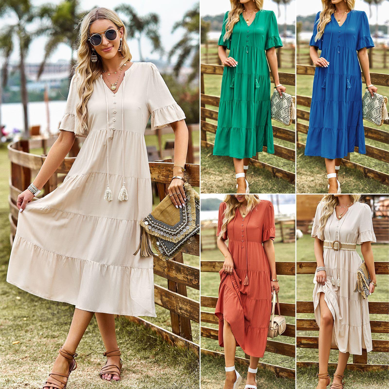 • Women's V Neck Tiered Boho Midi Dress 100% Viscose Short Flutter Sleeve Casual Loose Summer Beach Dress with Tassel Tie and Buttons for Women