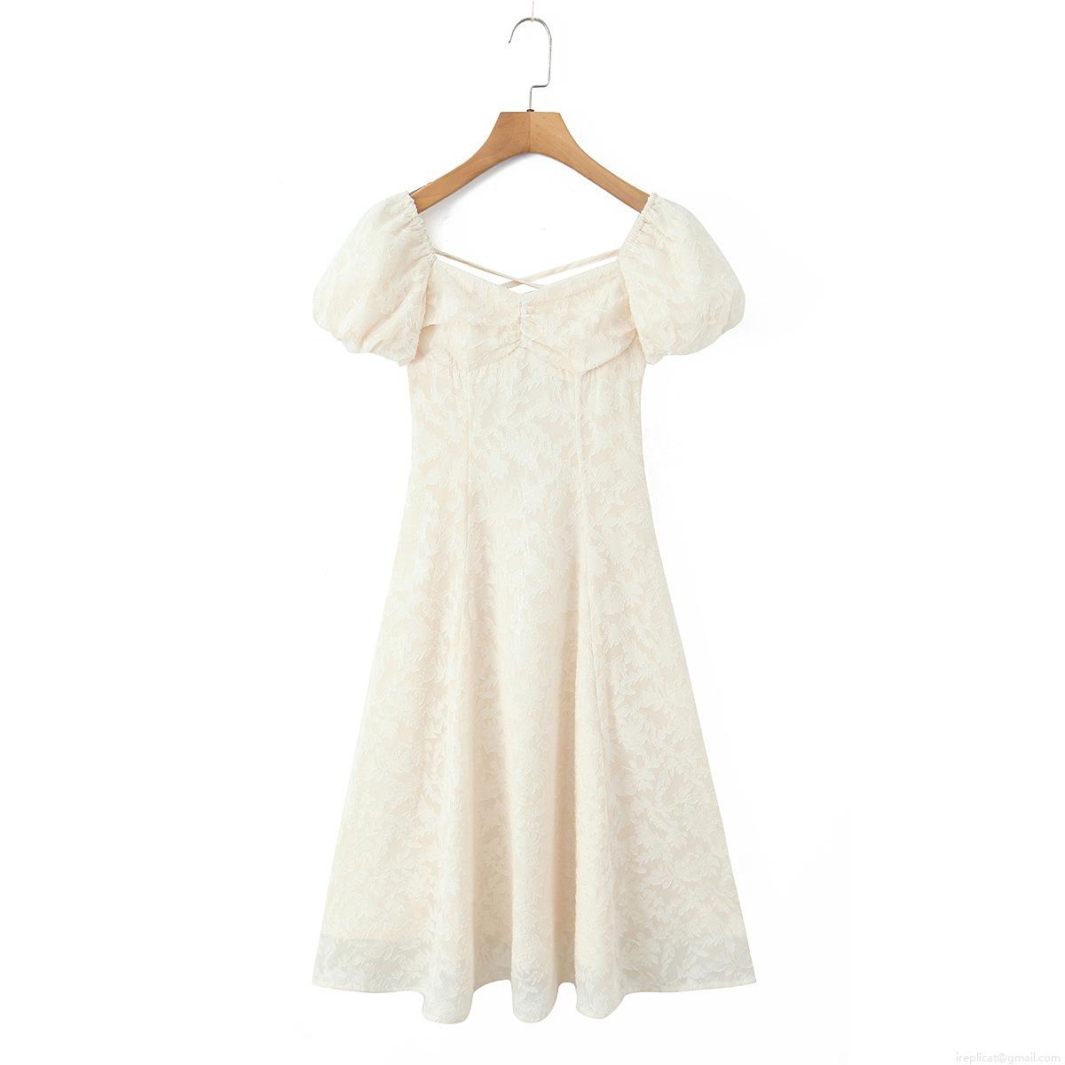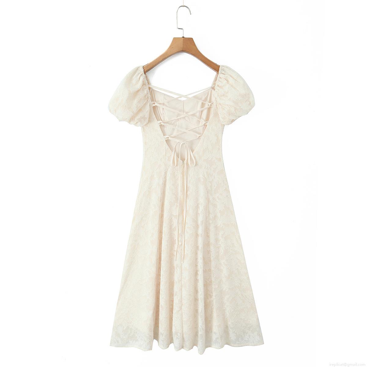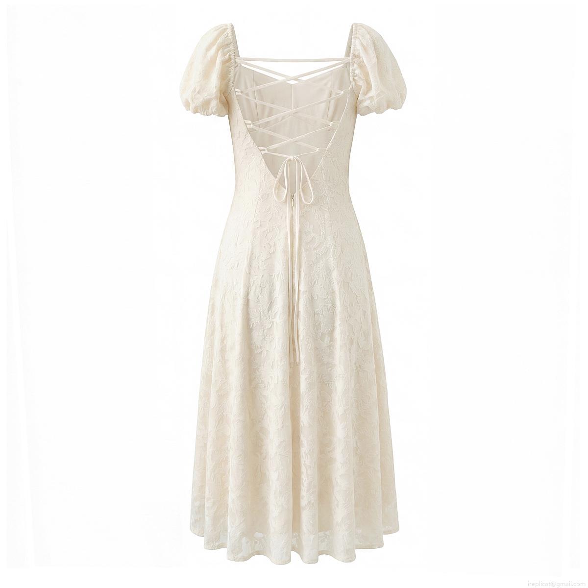 • Women's Vintage Lace Puff Sleeve Midi Dress Elegant Backless Cross Tie Jacquard Floral Dress For Summer Party Vacation Sexy Ivory White Sundress