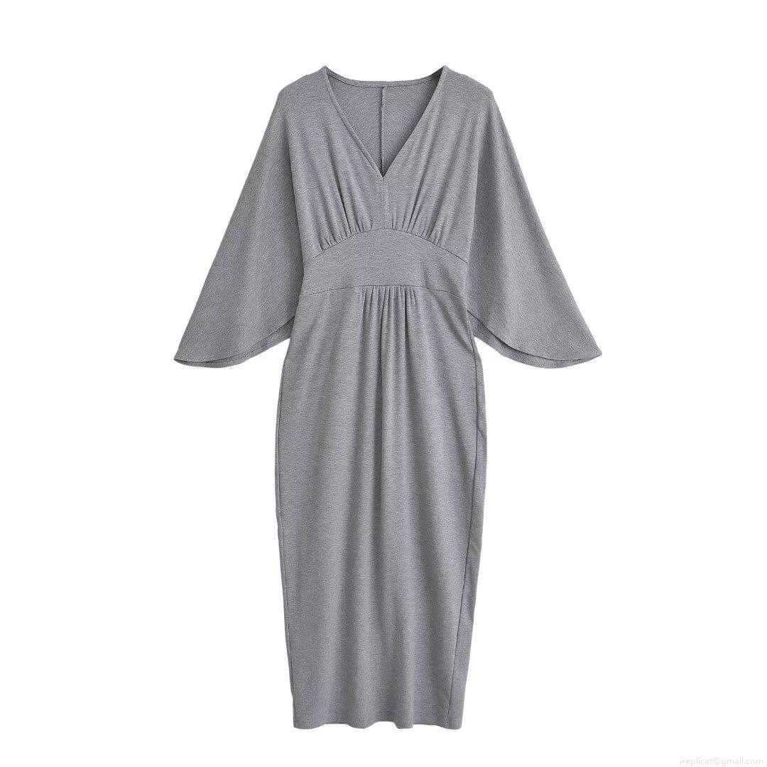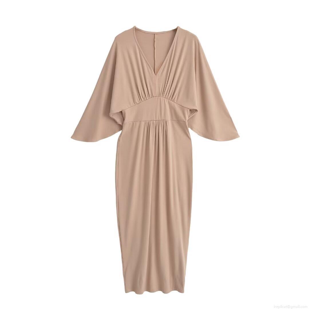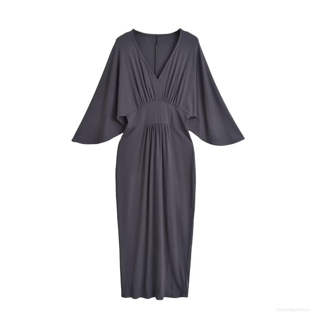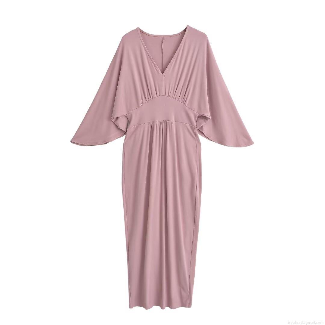 Solid Color, V-neck, Batwing Sleeves, Knitted Texture, Waist-cinching Pleats
