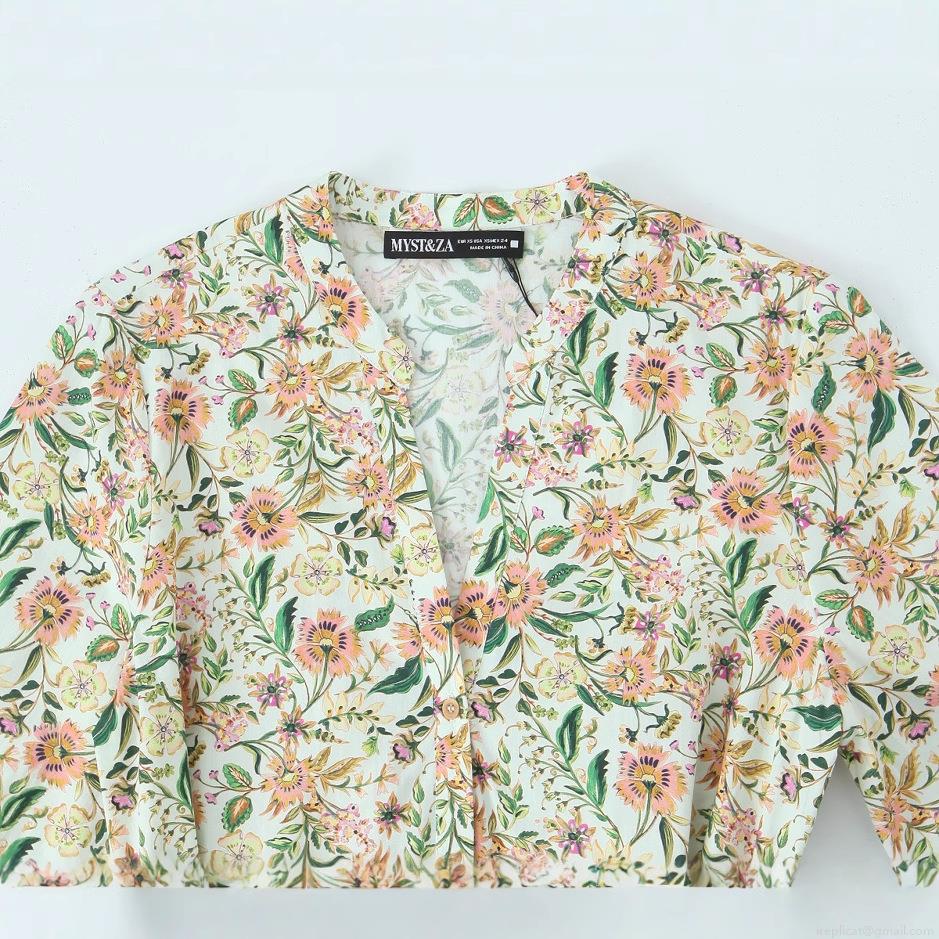 • Women's V-Neck Floral Print Midi Dress Elegant Polyester Nine-Point Sleeve A-Line Dress with Belt and Buttons for Casual Party