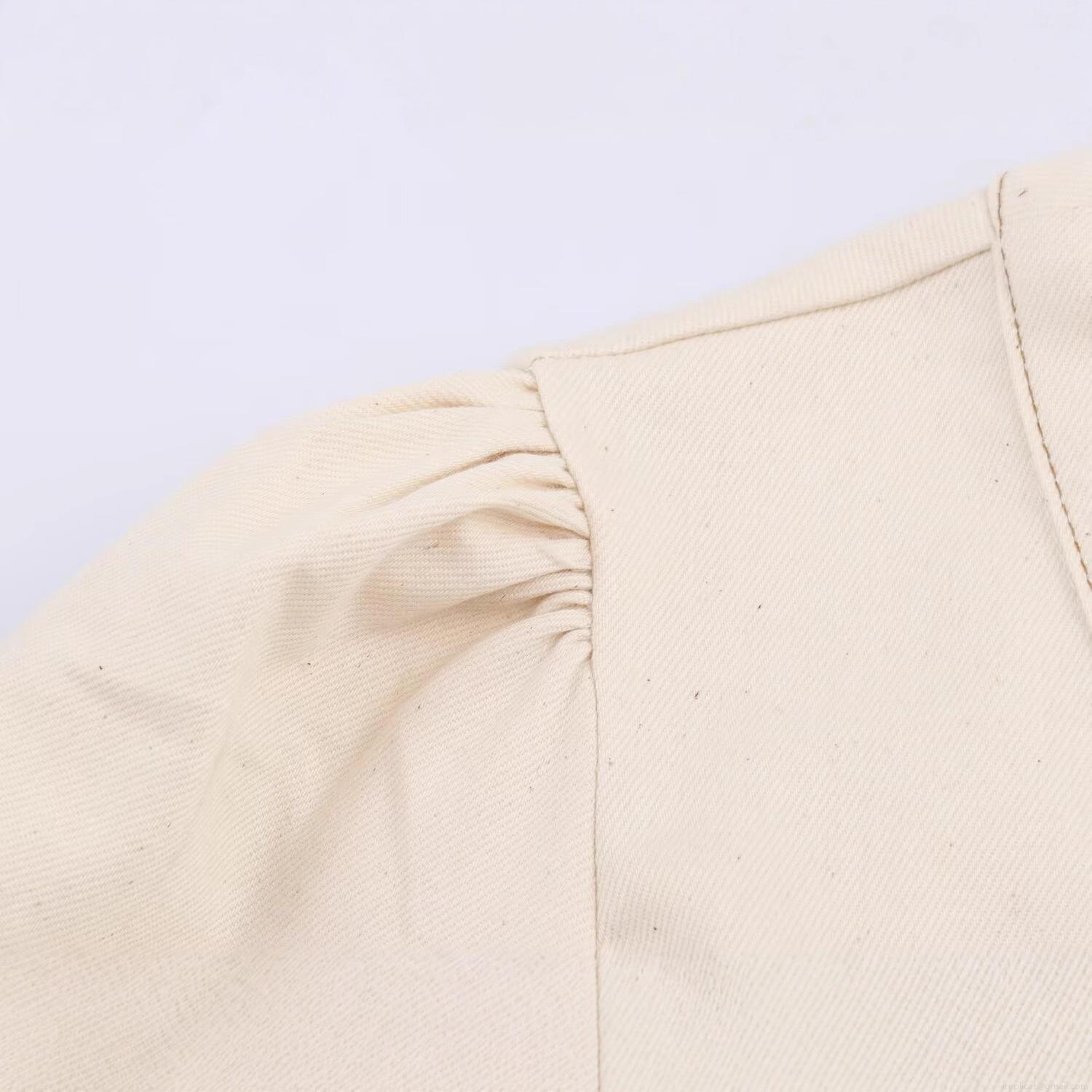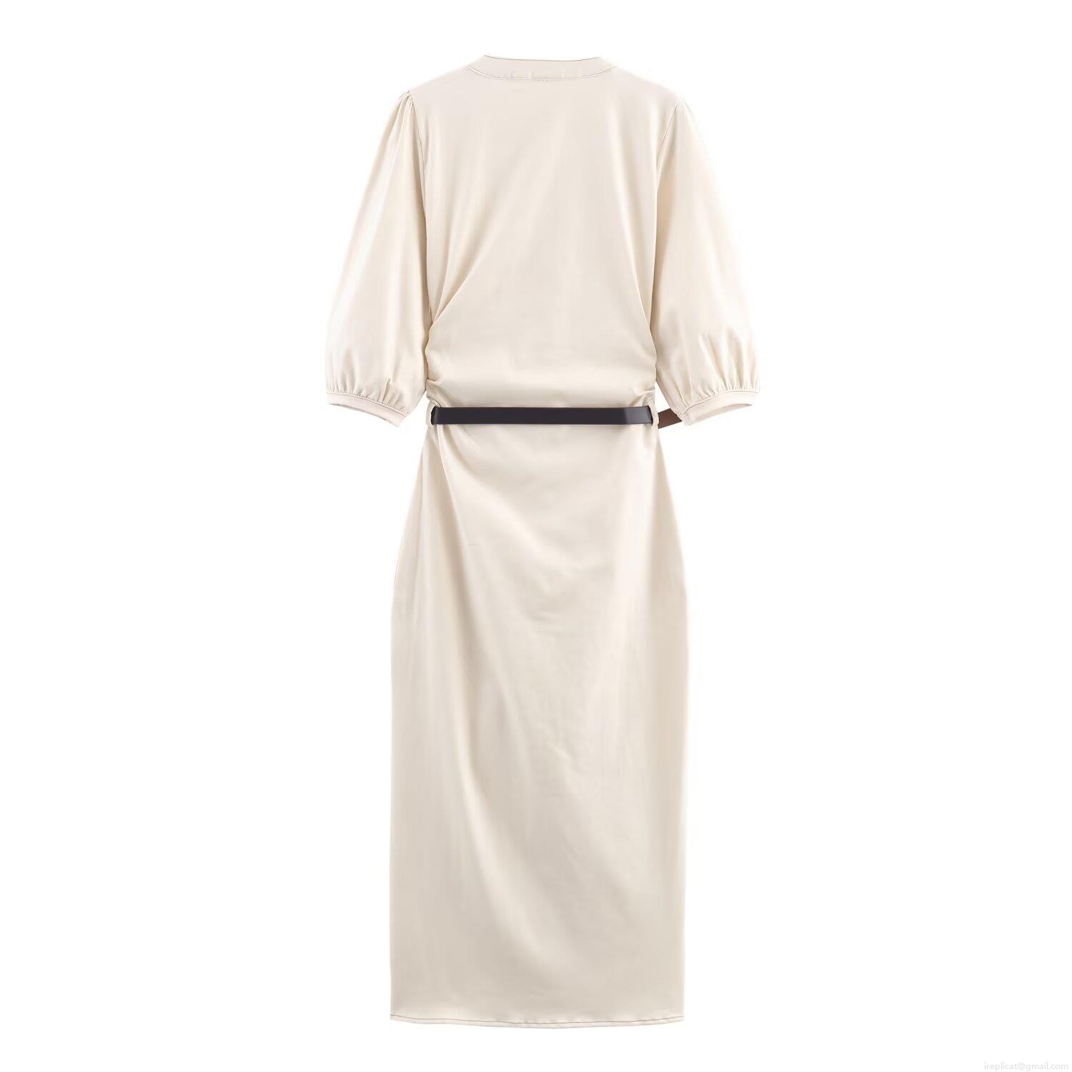 • Women's V-Neck Puff Sleeve Midi Dress With Belt Elegant Button Front Off-White A-Line Cotton Blend Denim Dress For Autumn Street Style