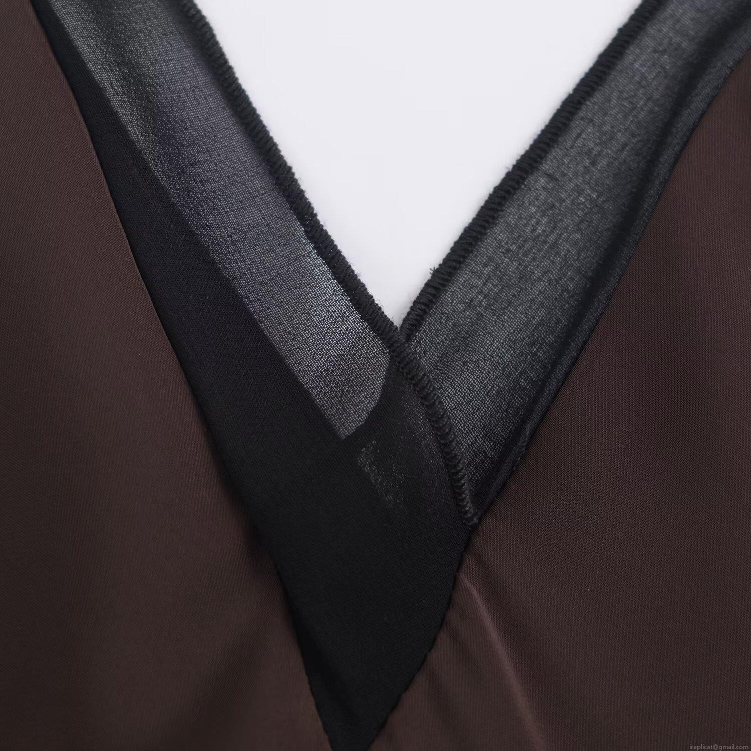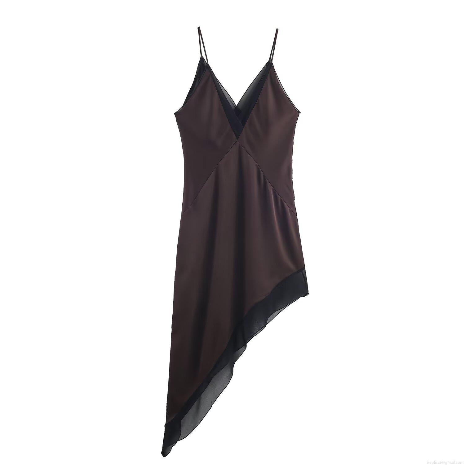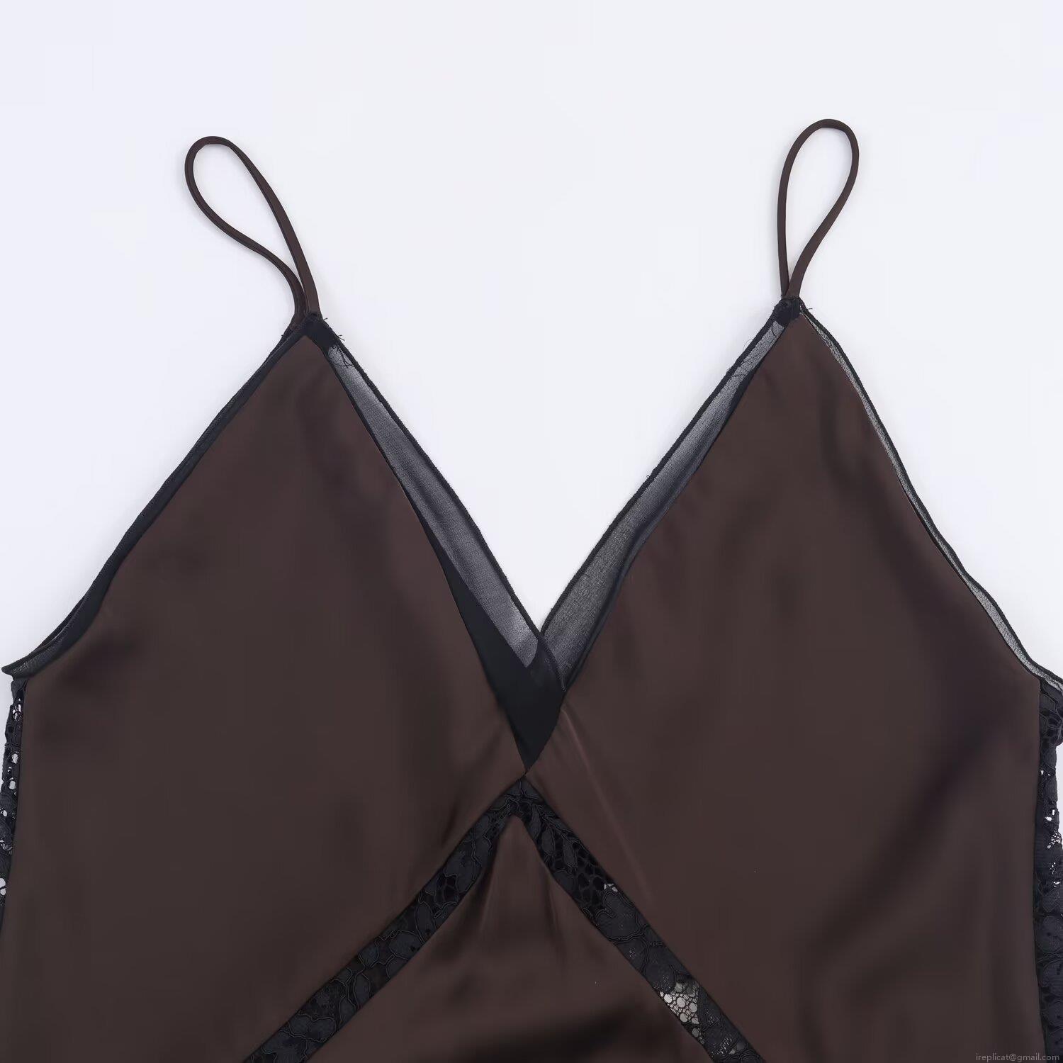 • Women's V-Neck Satin Asymmetric Midi Dress Lace Mesh Trim Sleeveless Spaghetti Strap Slip Dress Deep Brown Vacation Party Elegant Evening Cami Dress