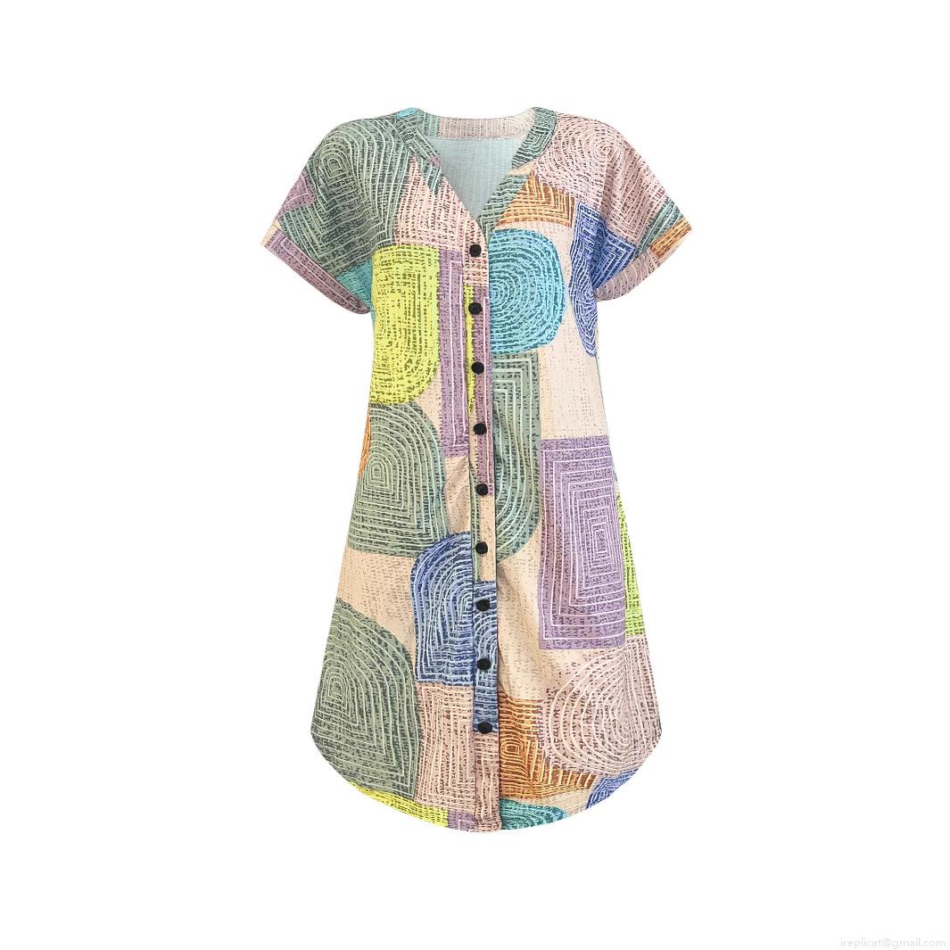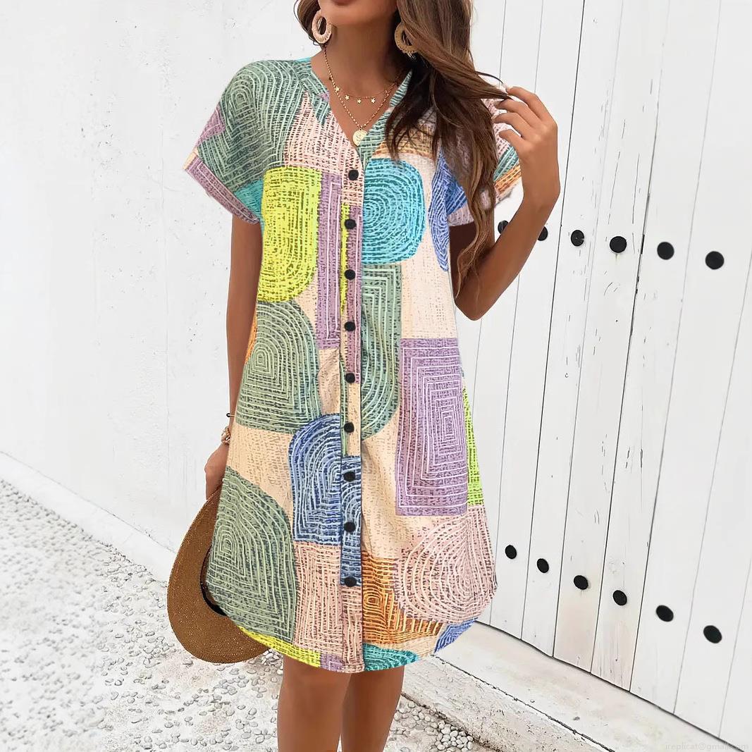 • Women's V-Neck Short Sleeve Geometric Print Midi Dress Fashion Loose Button A-Line Summer Vacation Bohemian Polyester Spandex Casual Dress