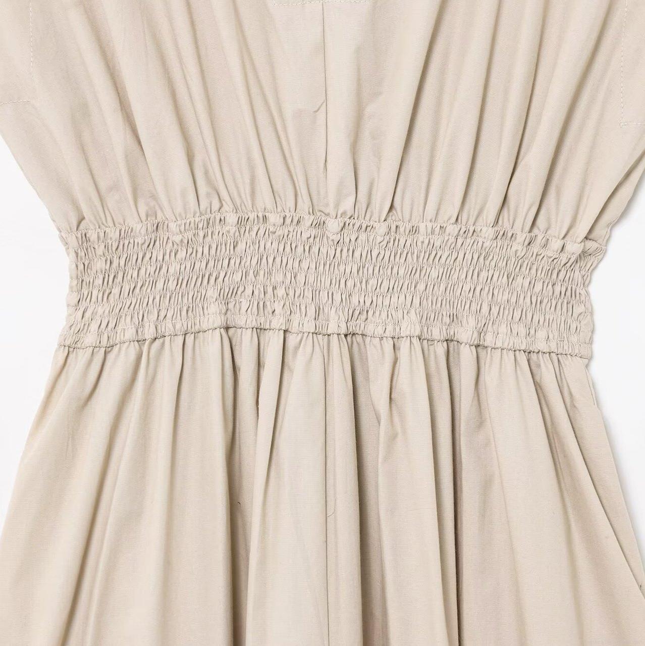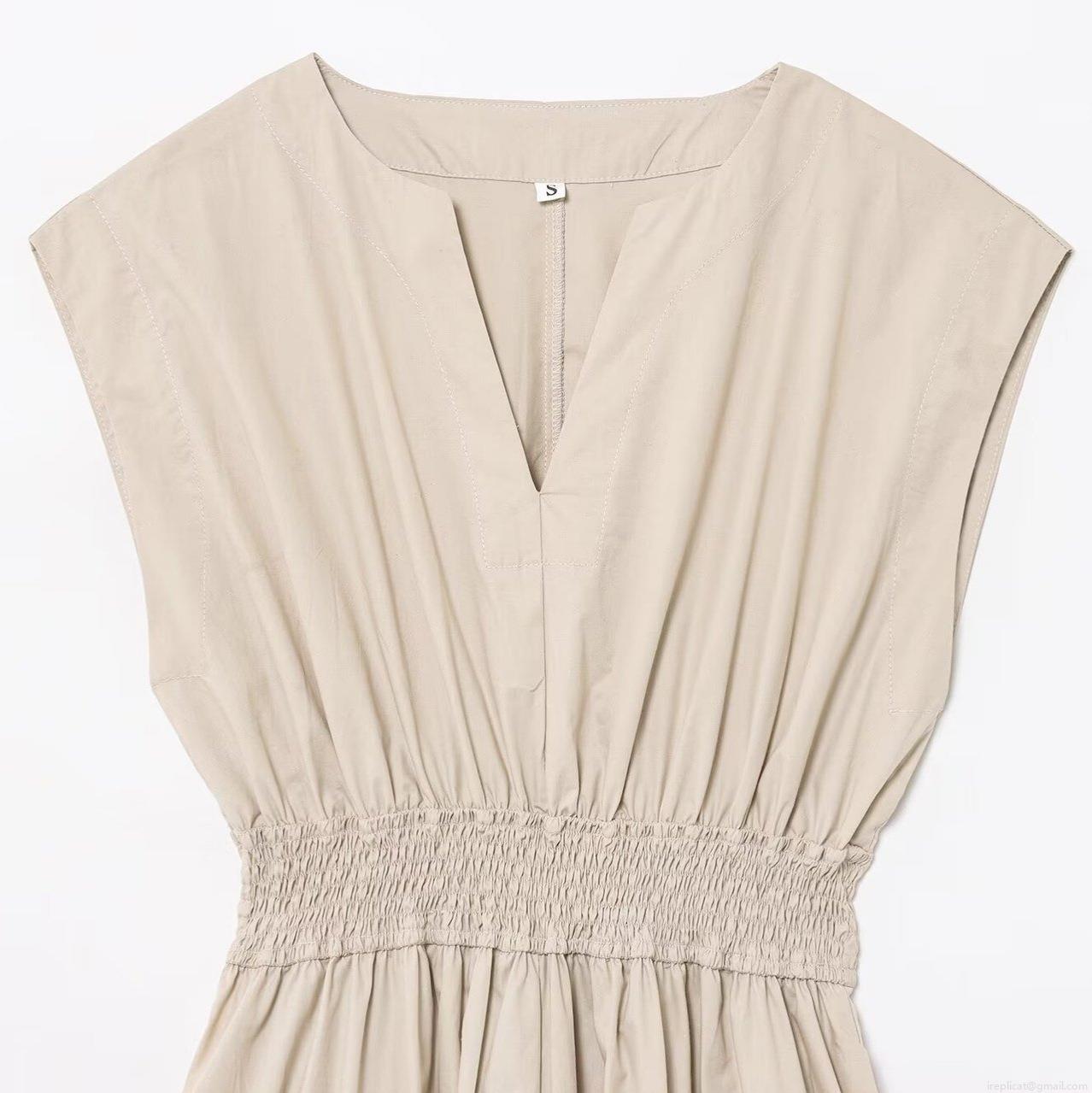 • Women's V-Neck Sleeveless Midi Dress Washed Cotton Polyester Blend Elastic Waist Pleated A-Line Sundress Casual Summer Solid Color Fashion Dress for Women