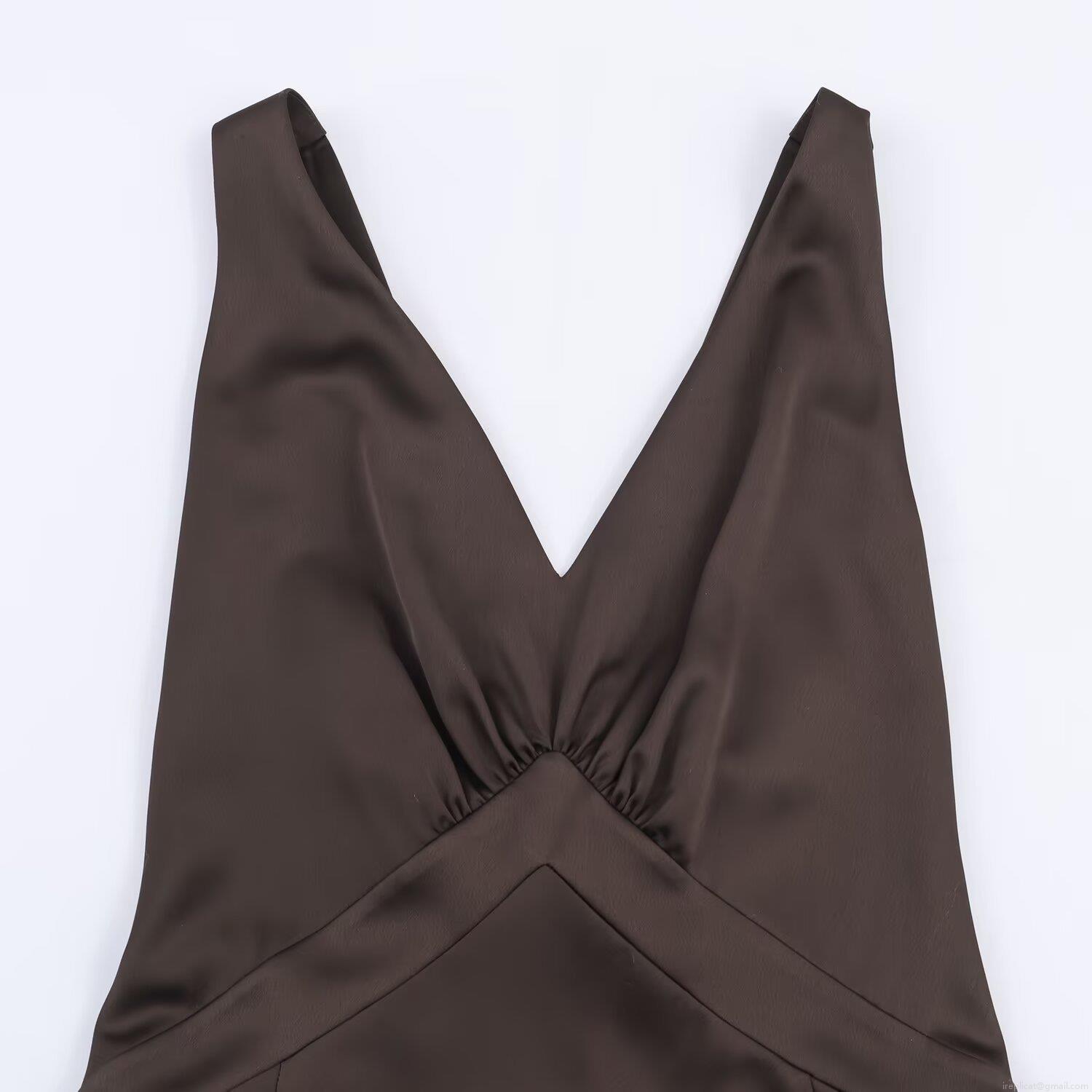 Women's V-Neck Sleeveless Satin Midi Dress Solid Coffee Brown Waist Pleated High Slit A-Line Elegant Party Evening Long Dress For Ladies