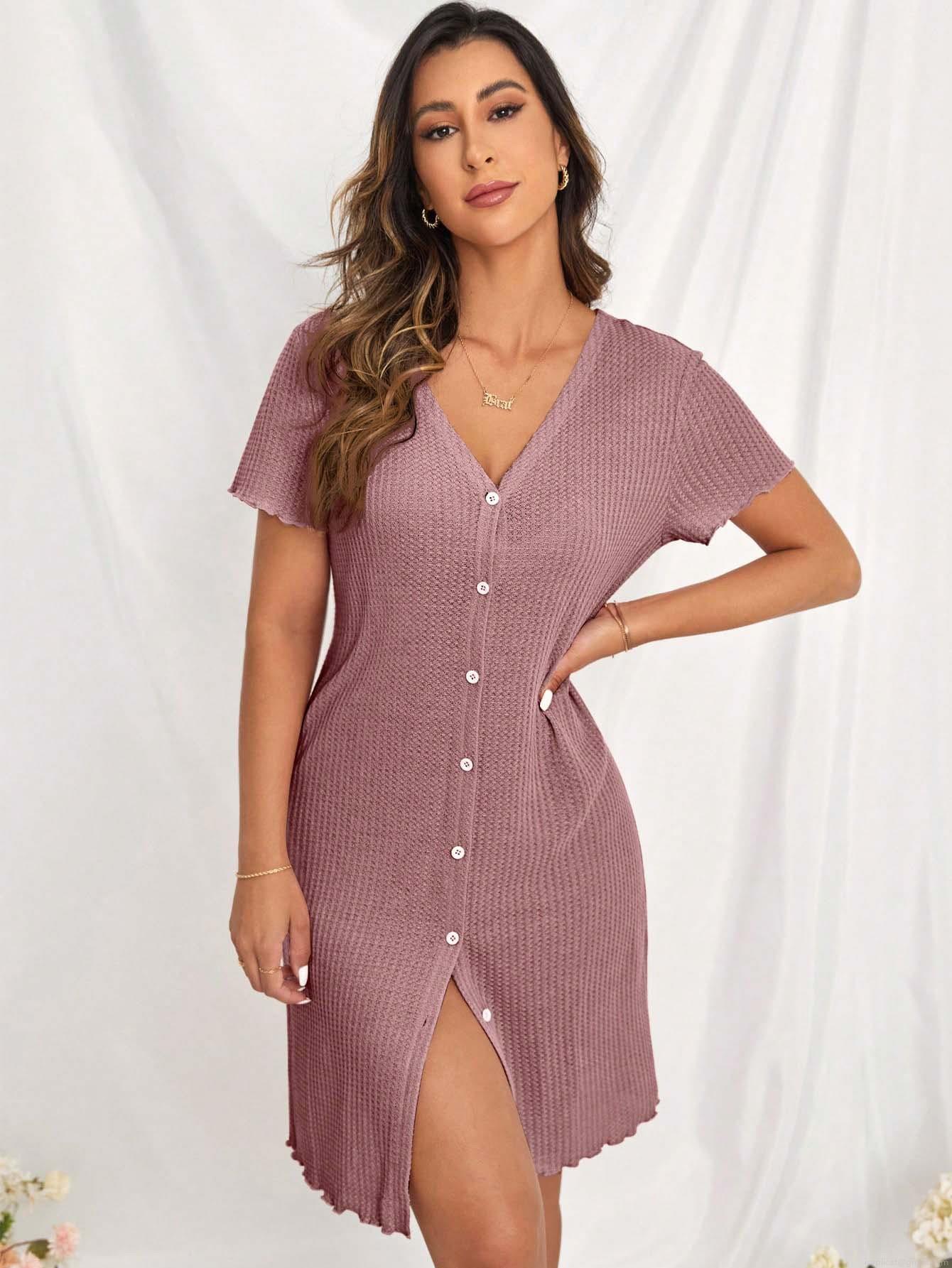 • Women's Waffle Knit Loungewear Dress V-Neck Short Sleeve Button Down Nightgown Summer Loose Casual Solid Color Midi Sleepwear Dress