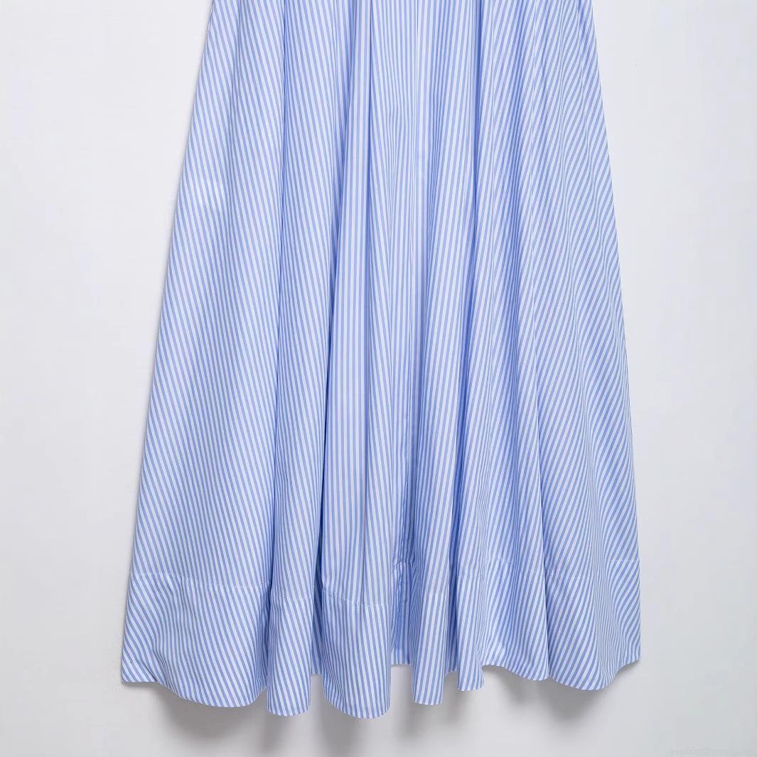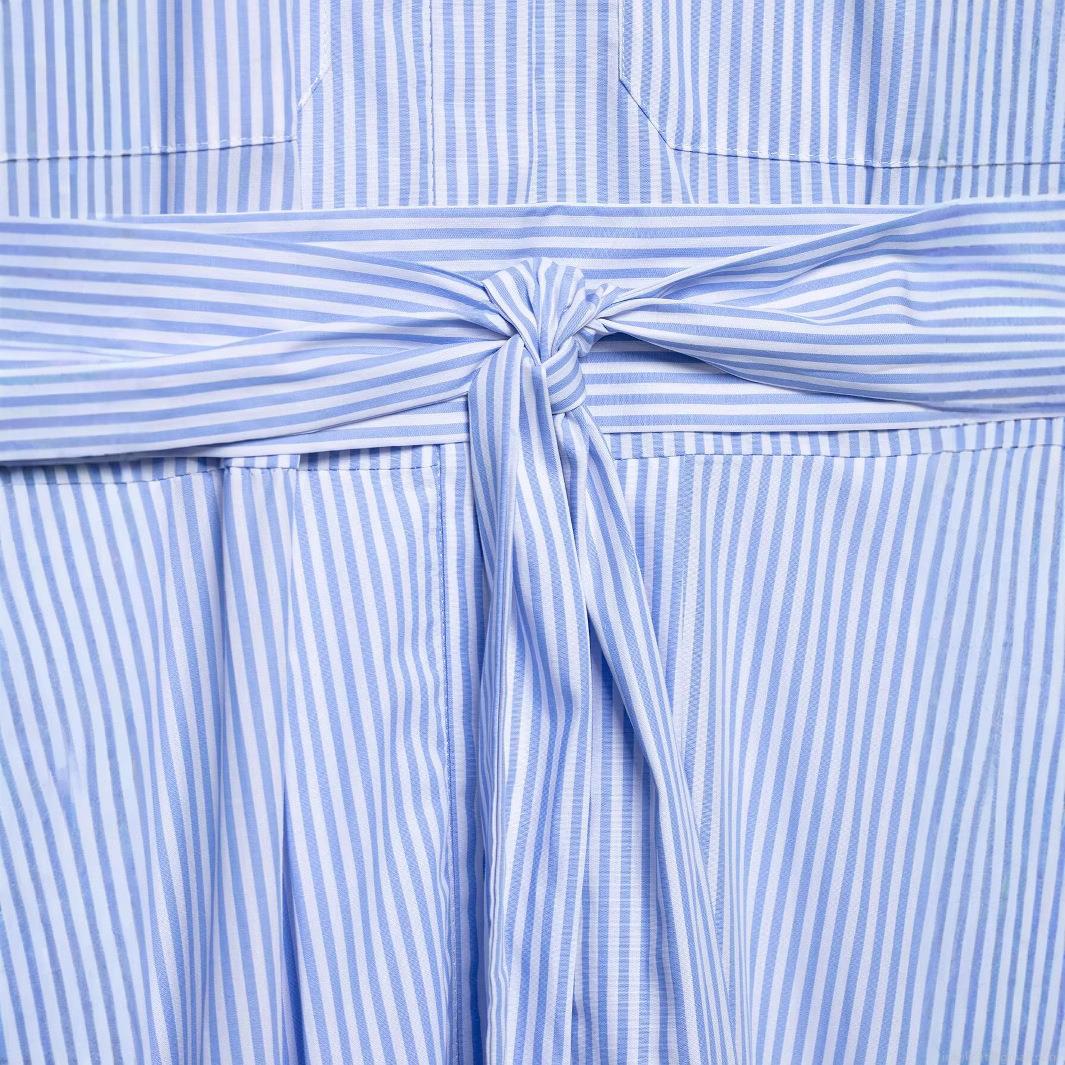 • Women's Western Style Blue Striped Shirt Dress Lapel Short Sleeve Midi Polyester Dress With Belt For Daily Office Casual Elegant Clothing