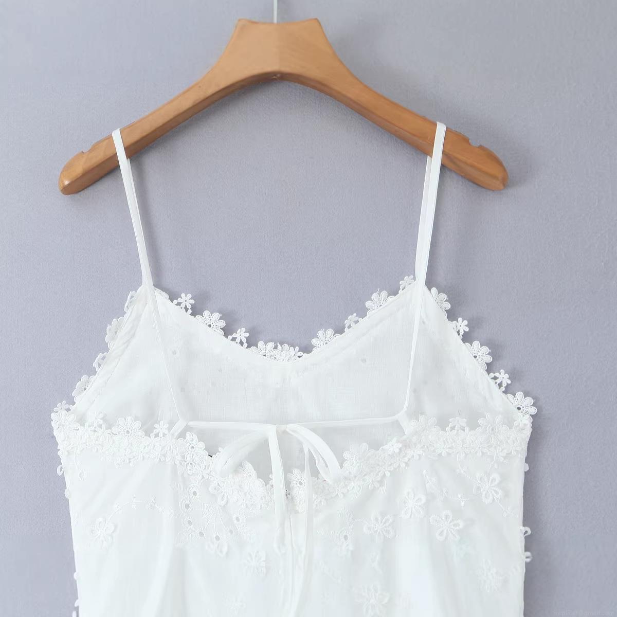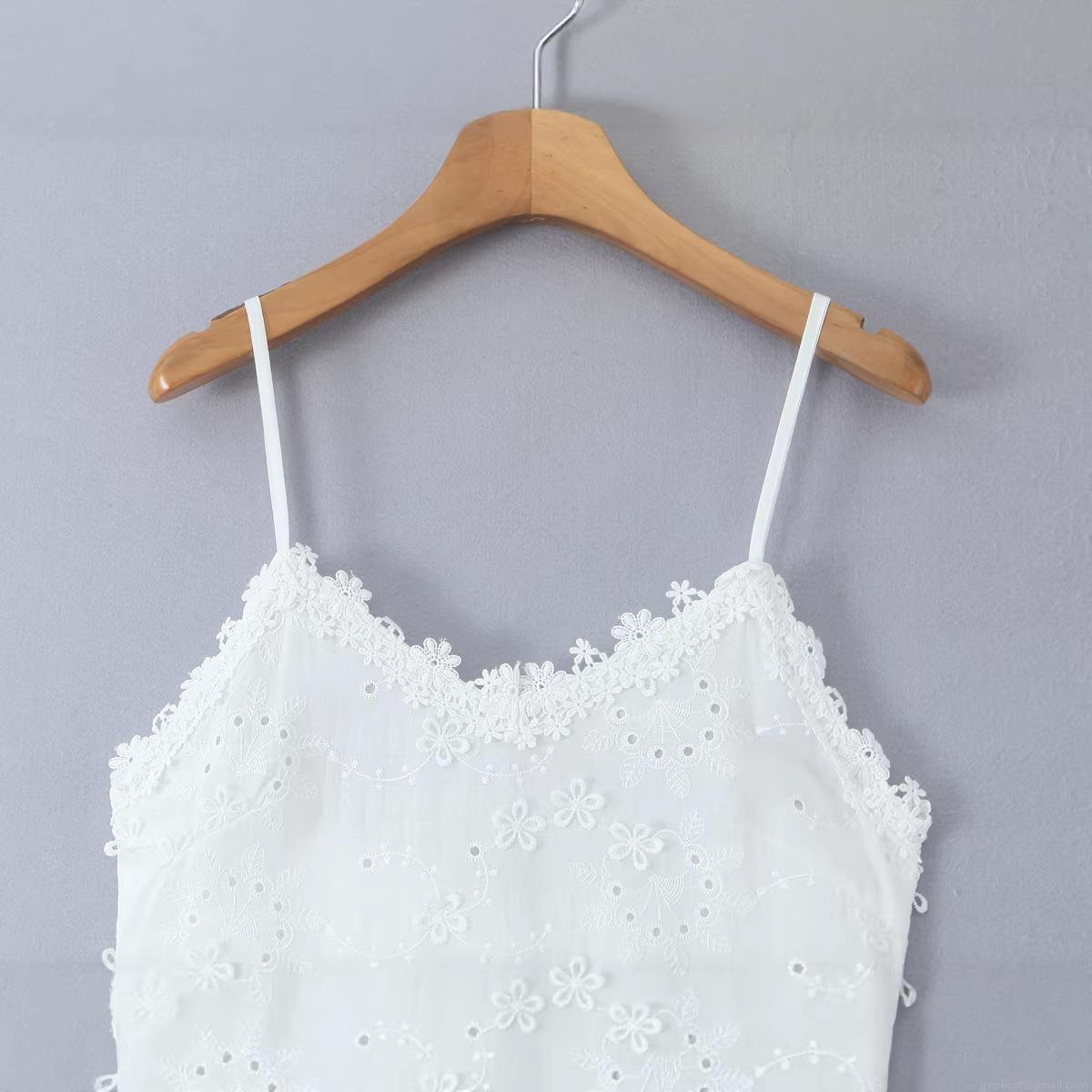 Women's White 100% Cotton Embroidery Cami Midi Dress Sexy Hollow Out Lace Bohemian Vacation Sleeveless Ruffle Hem A-Line Dress