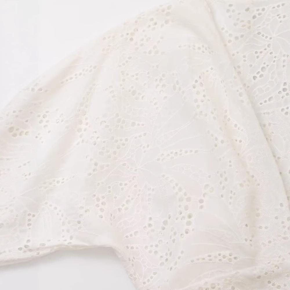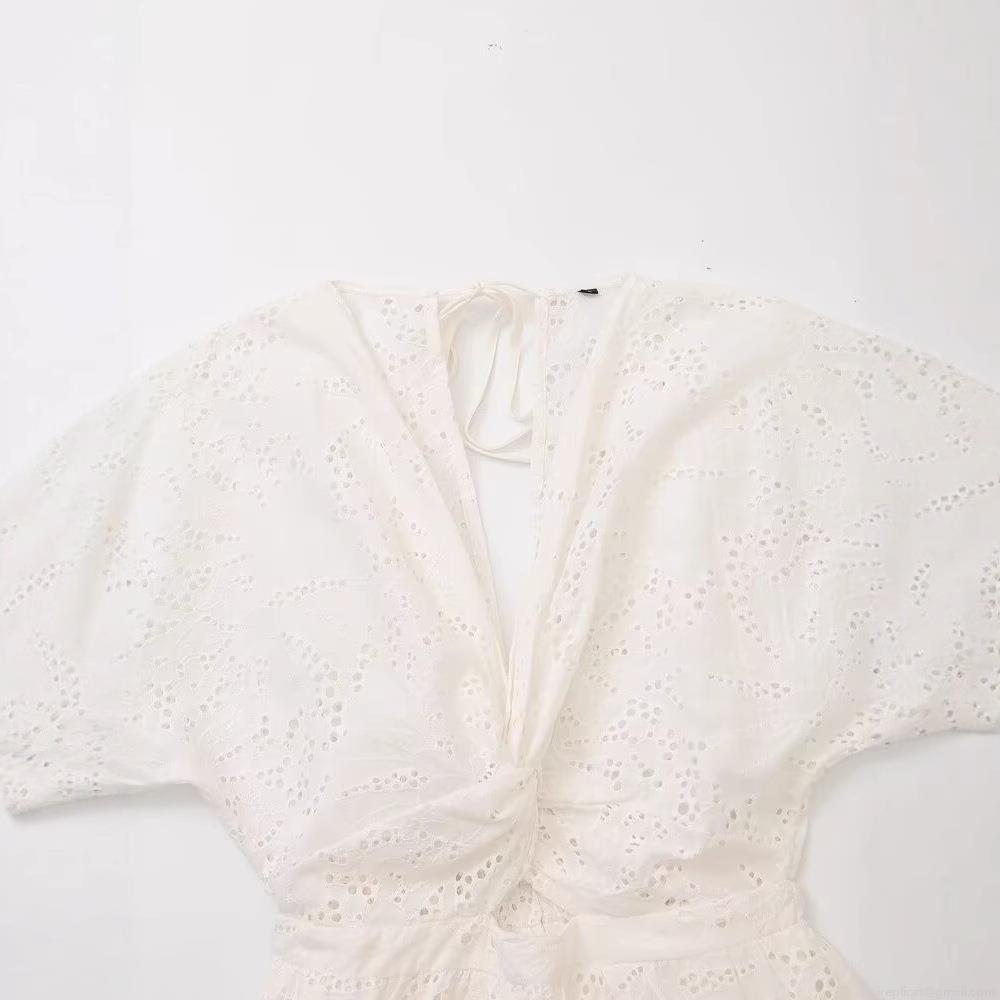 • Women's White Hollow Out Embroidery Midi Dress Elegant V-Neck Puff Short Sleeve Bow Tiered Cake Dress Cotton Blend Summer Party Street Fashion Dress