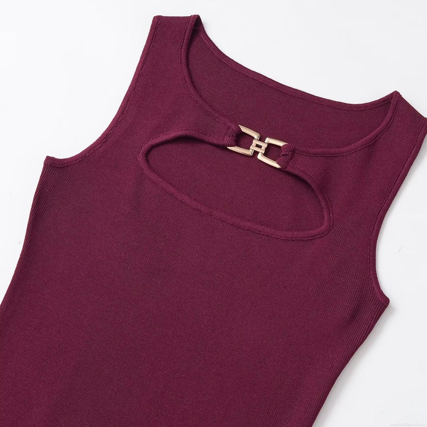 Women's Wine Red Knit Midi Dress With Hollow Out Design Metal Buckle Sleeveless Round Neck Slim Fit Winter Bodycon Party Dress