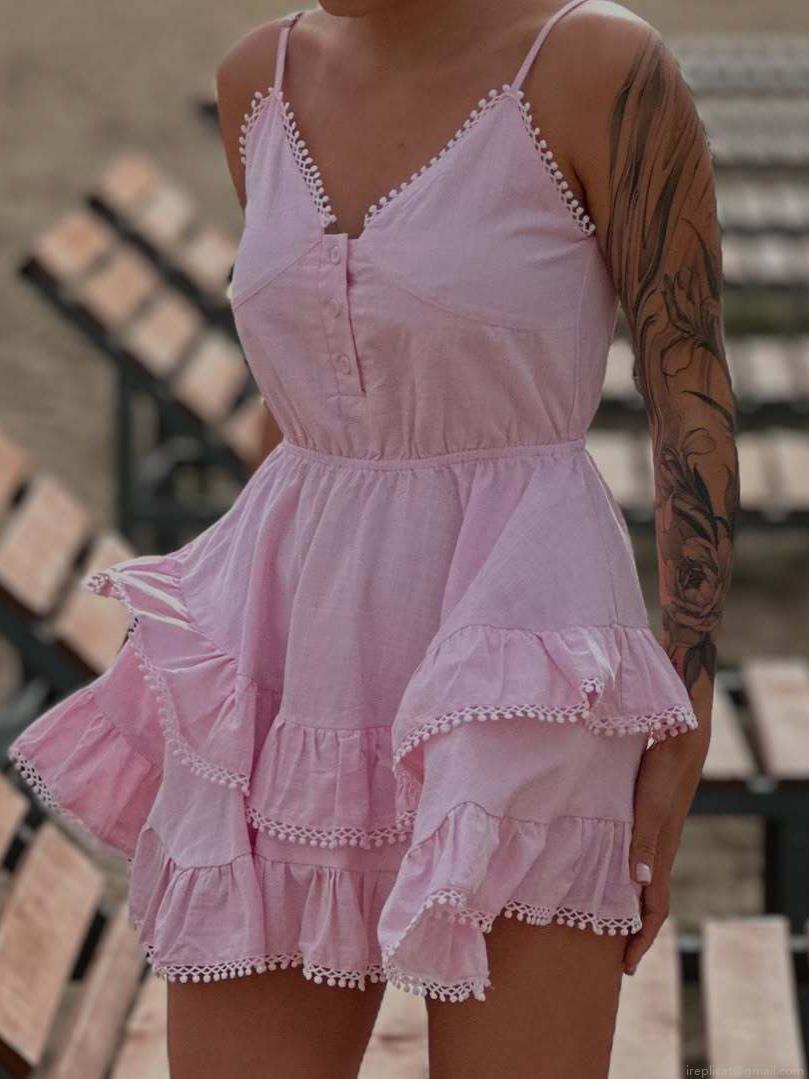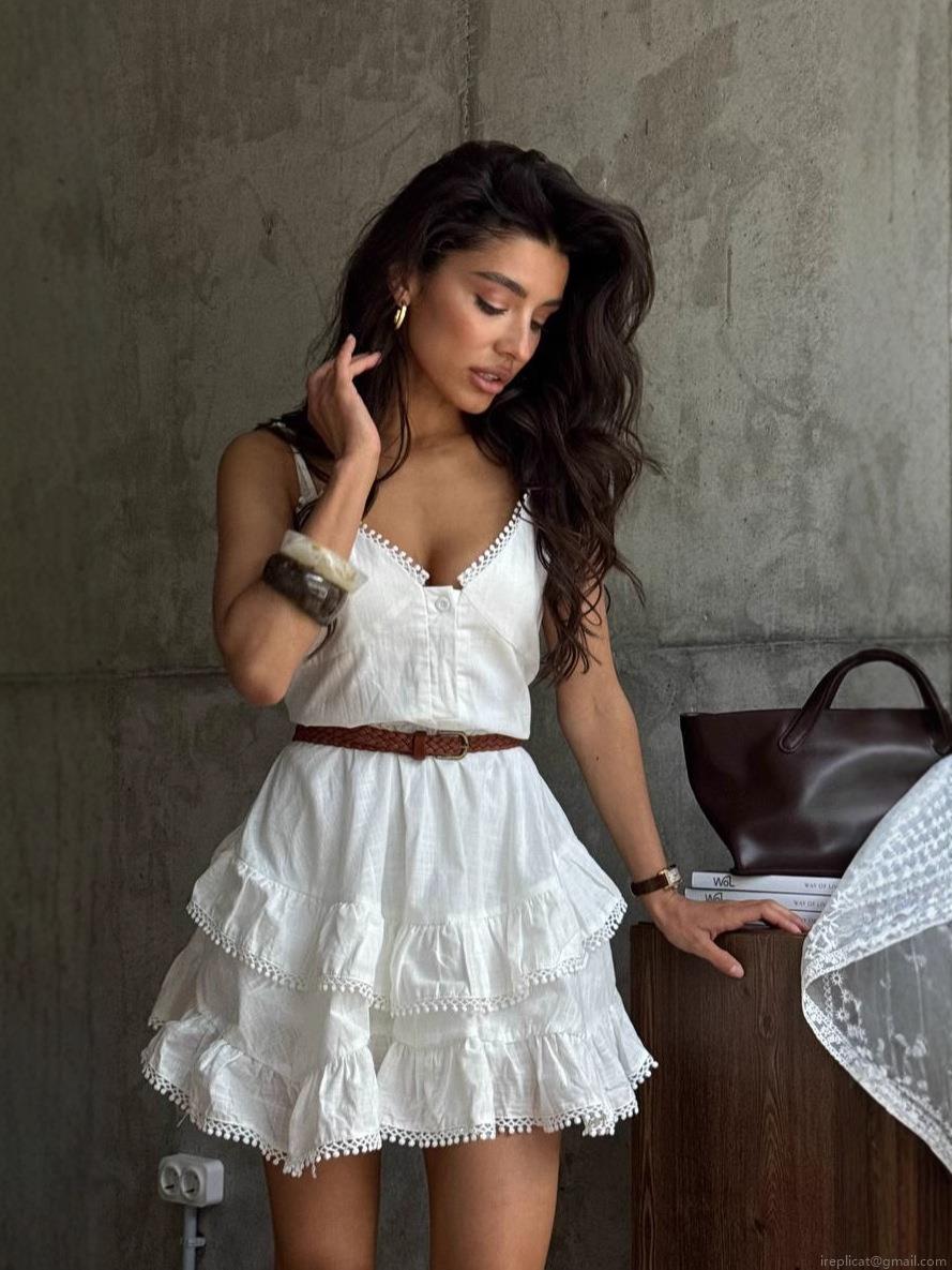 • Bohemian Lace Trim Layered Cake Mini Dress With Braided Belt Women Sexy V Neck Sleeveless Summer Holiday Cotton Blend Party Beach Short Dress