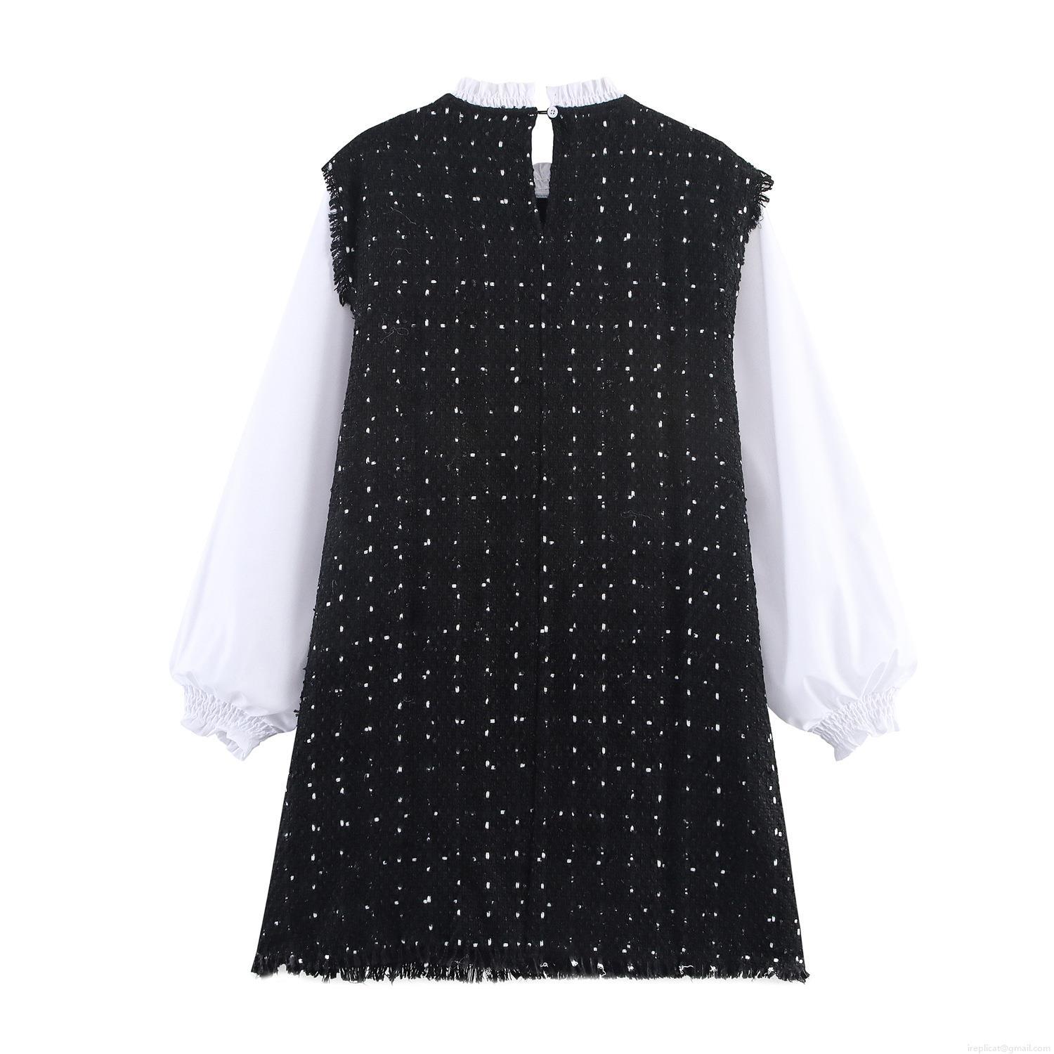 Elegant Black And White Contrast Tweed Mini Dress With Ruffle Neck Long Sleeve Puff Sleeves Button Details Lady Style Party Evening Dress For Women