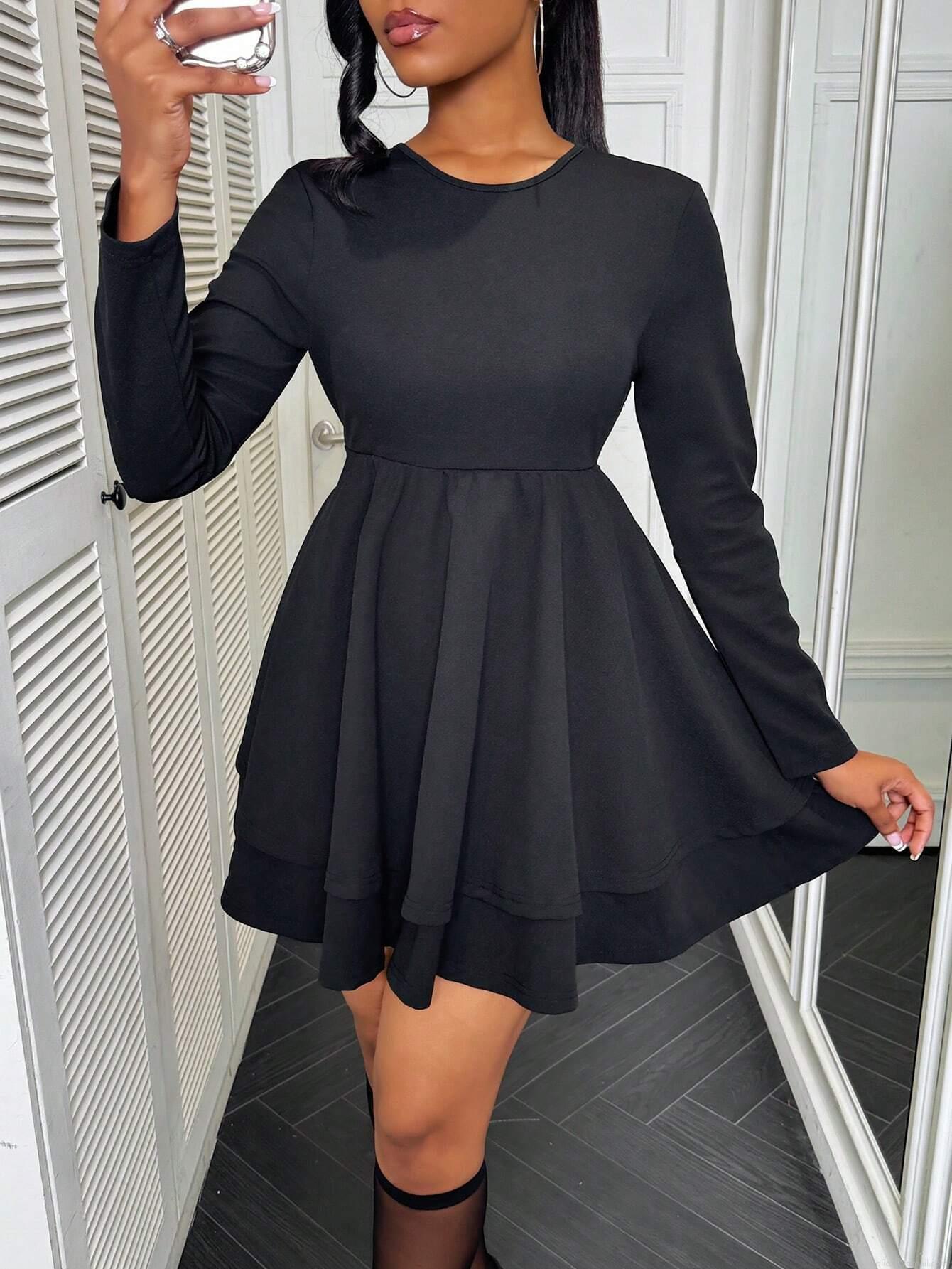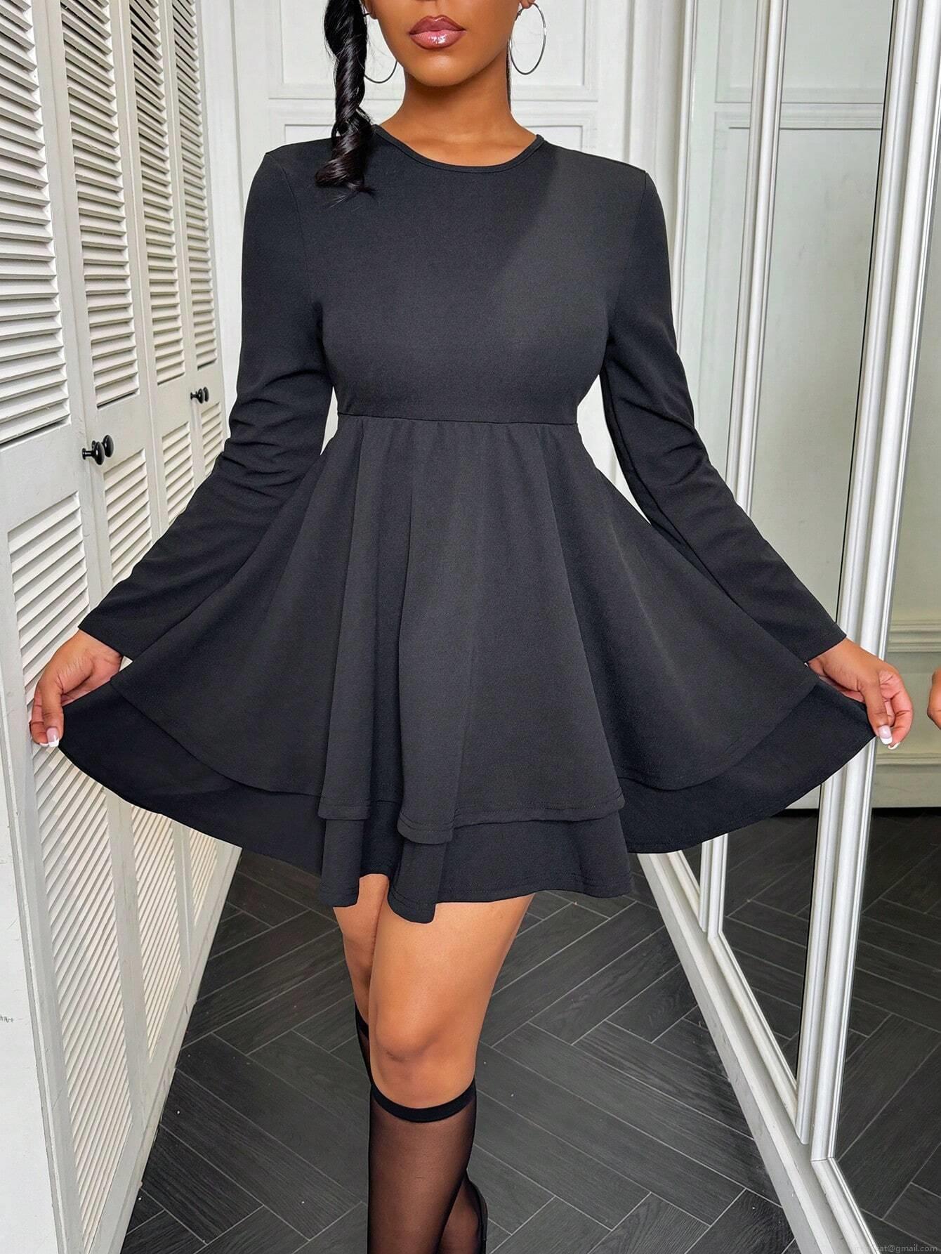 • Elegant Black Long Sleeve Backless Dress With Bow Design Women Sexy Mini A-Line Party Dress Double Ruffle Hem Knitting Polyester Spandex Clothing