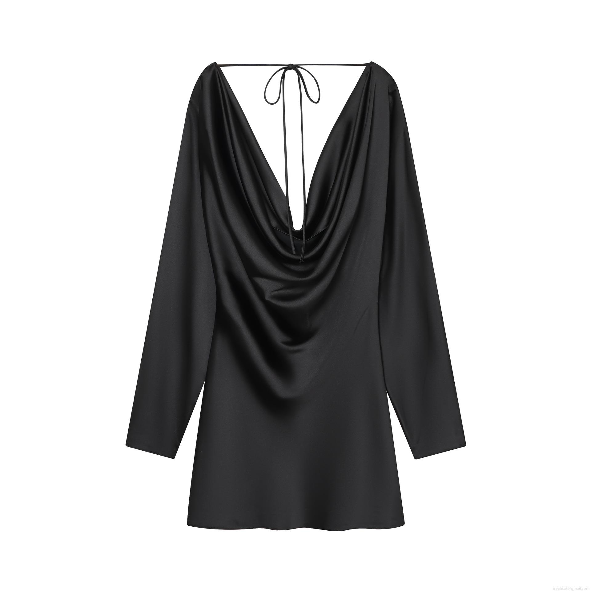 • Elegant Cowl Neck Satin Mini Dress Sexy Deep V-Neck Backless Tie-Back Long Sleeve Party Evening Cocktail Dress for Women Solid Black Silk Texture Short Dress