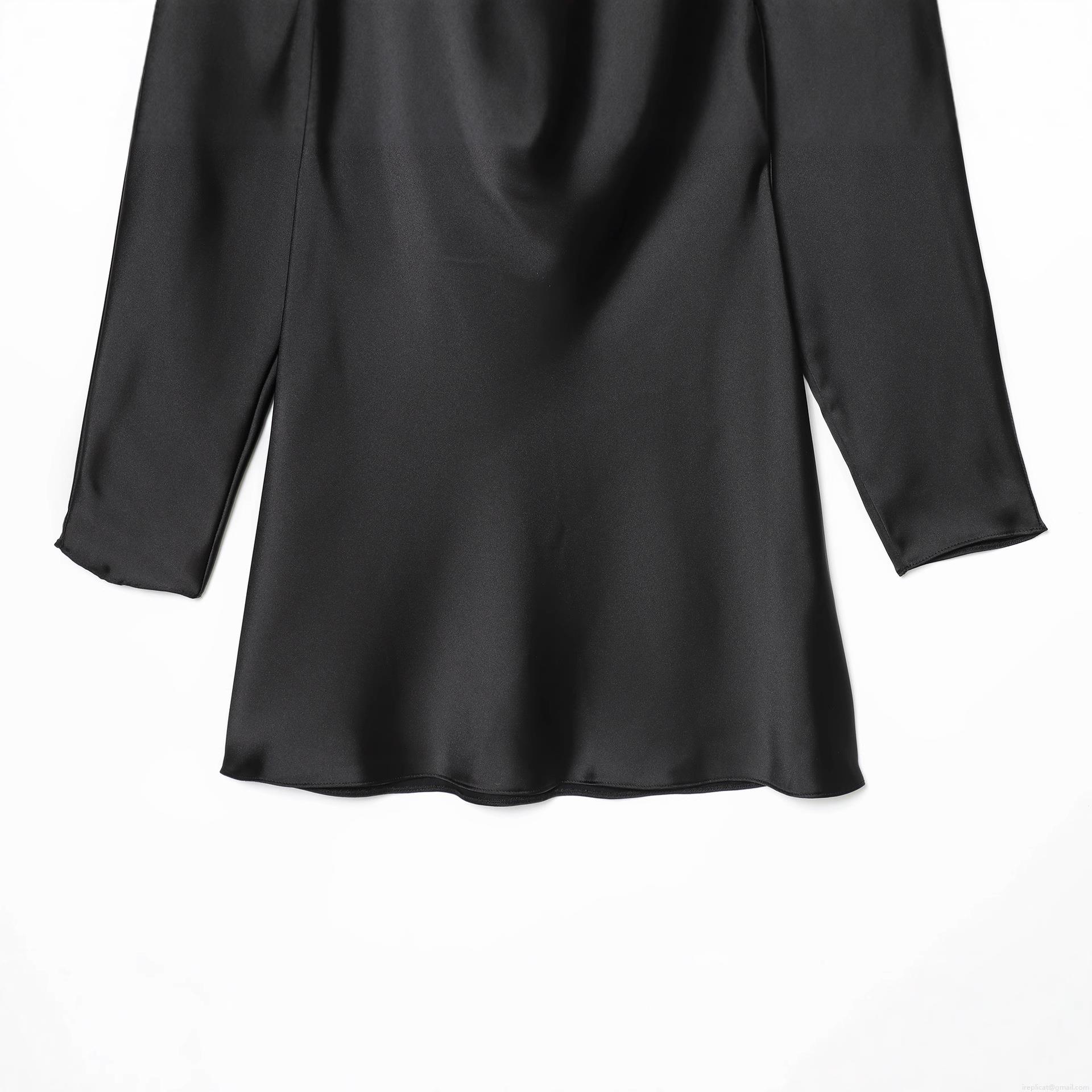 Elegant Cowl Neck Satin Mini Dress Sexy Deep V-Neck Backless Tie-Back Long Sleeve Party Evening Cocktail Dress for Women Solid Black Silk Texture Short Dress