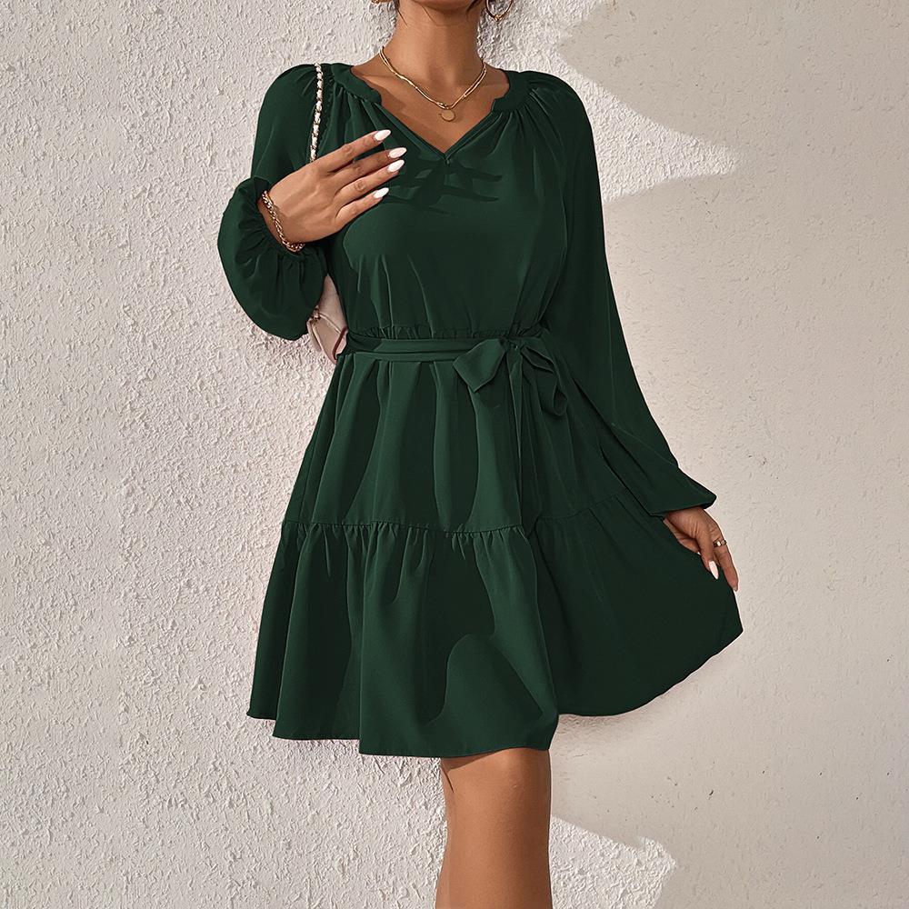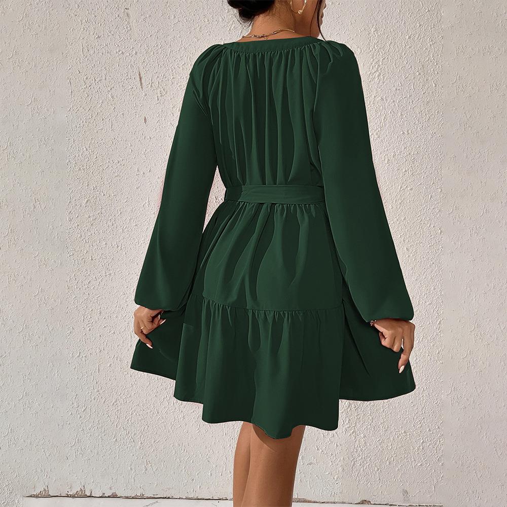 • Elegant Dark Green 100% Polyester V-Neck Long Puff Sleeve Layered Ruffle Mini Dress with Belted Waist for Women Daily Party Office Commuter Outfits