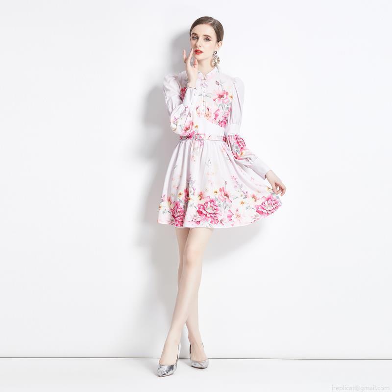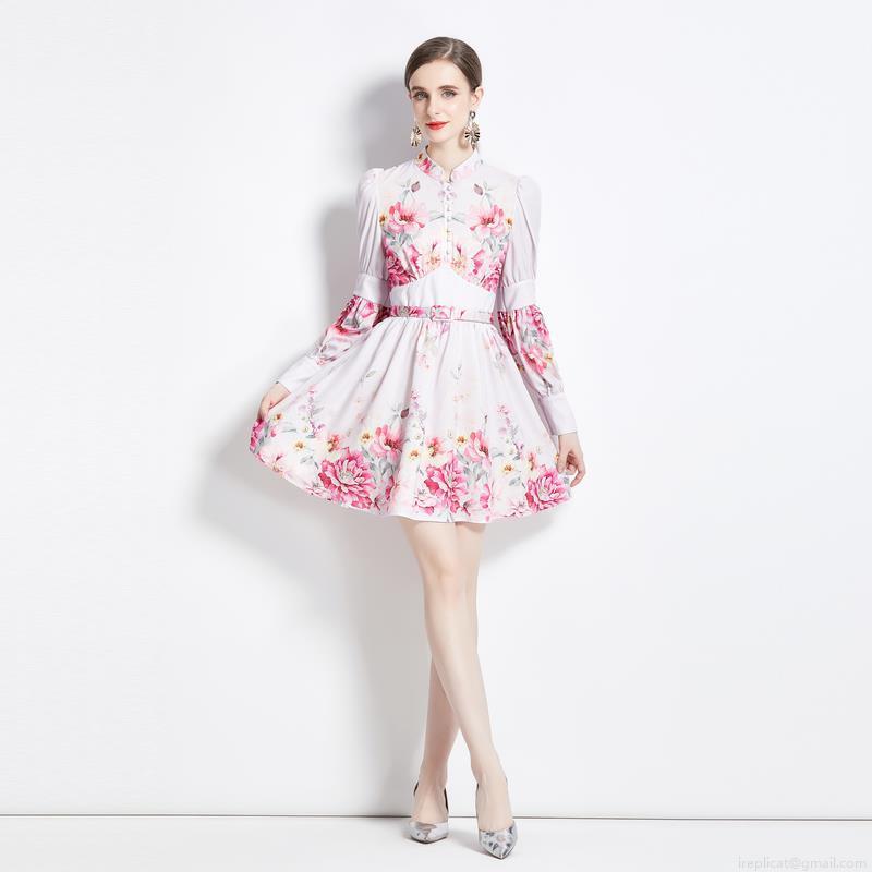 Elegant Floral Print Mini Dress Women Retro Stand Collar Long Lantern Sleeve Chiffon Short Dress With Belt Sweet A-Line Party Dress