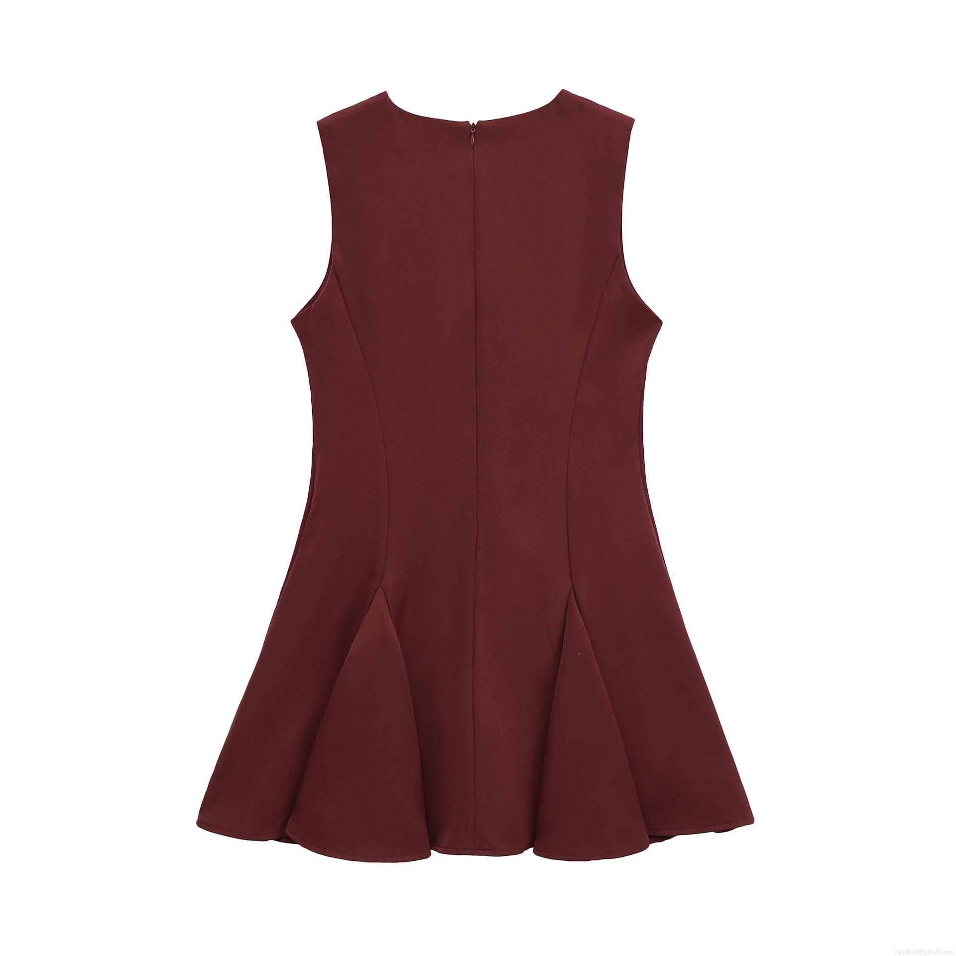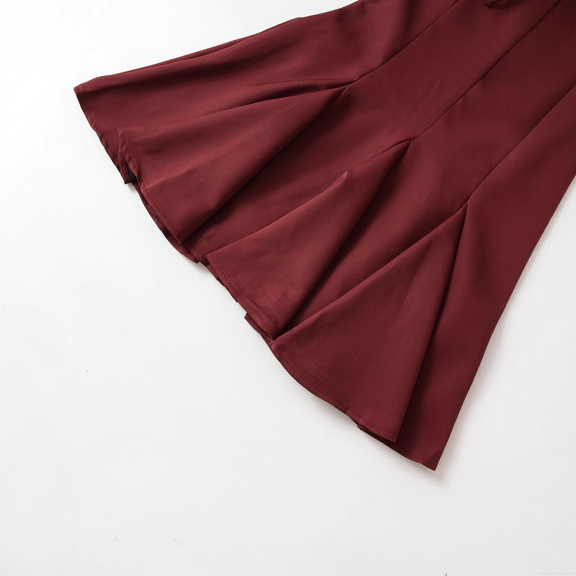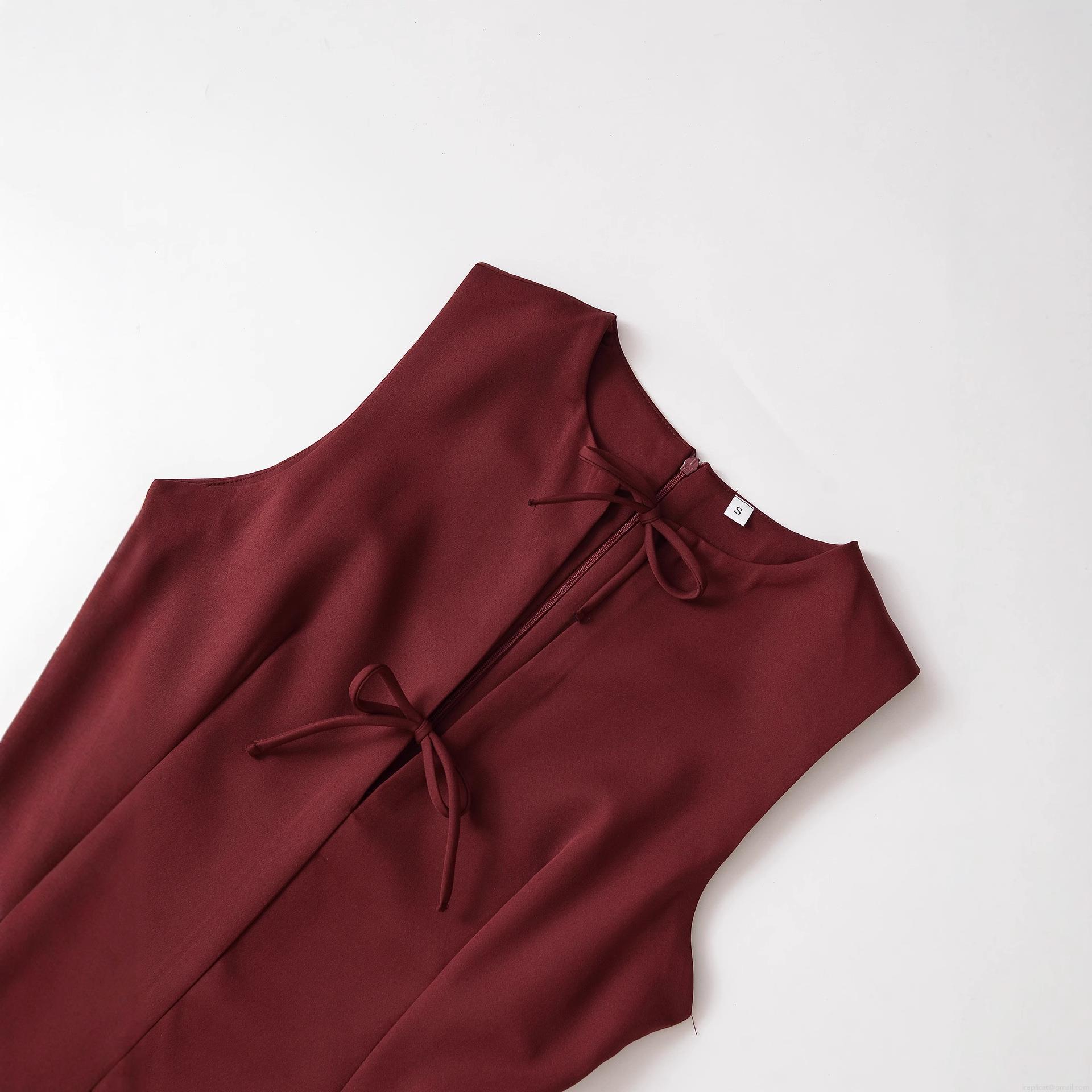 • Elegant French Style Burgundy Sleeveless V Neck Mini Dress With Bow Tie Front And Fishtail Hem Polyester Bodycon Party Dress For Women