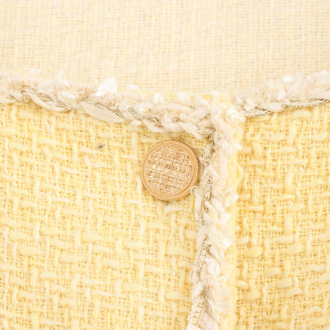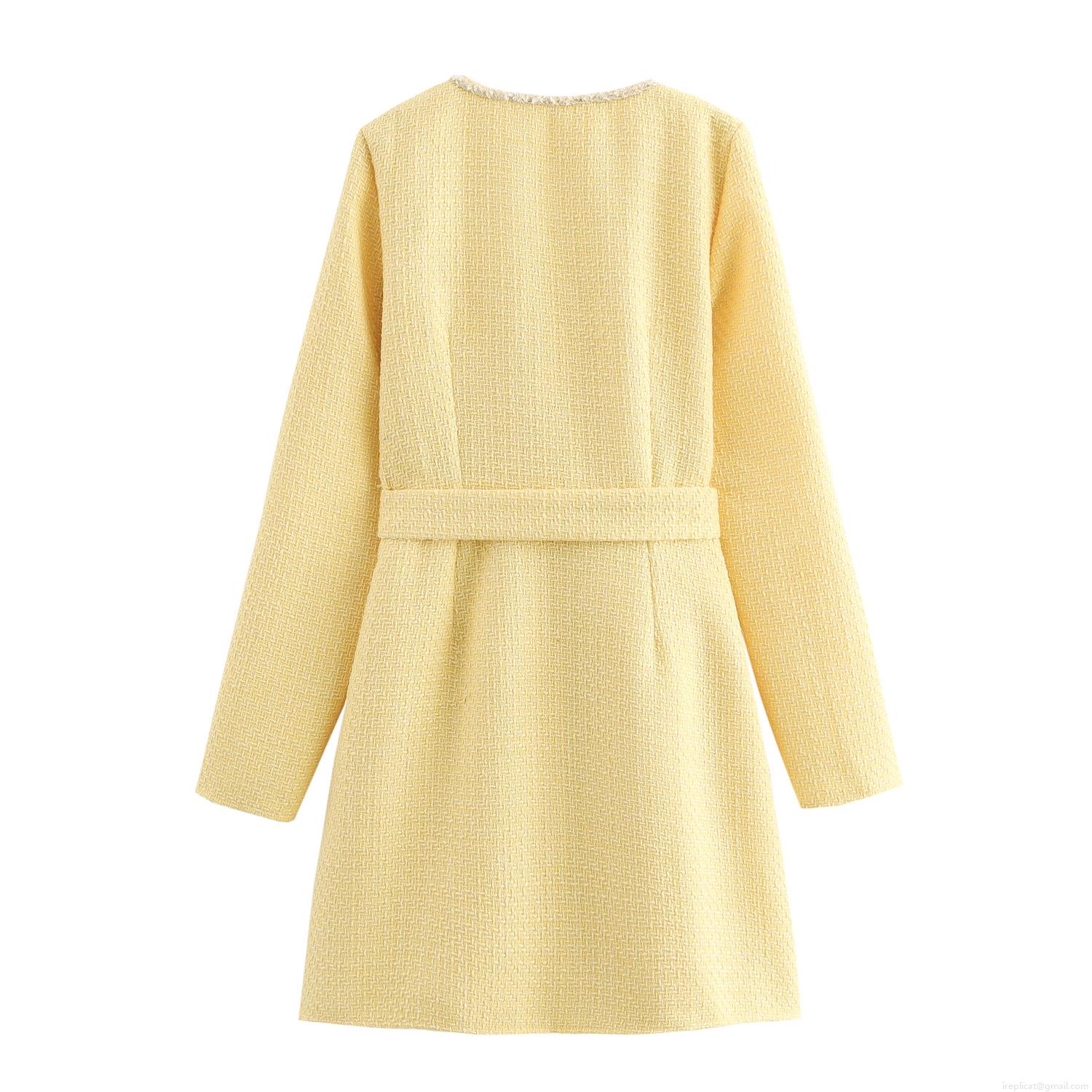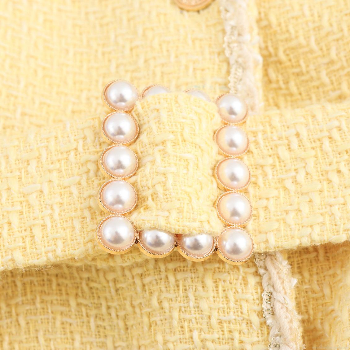 • Elegant French Style Yellow Tweed Mini Dress With Pearl Belt Square Neck Long Sleeve Polyester A-Line Slim Fit Dress For Women Party Daily Wear