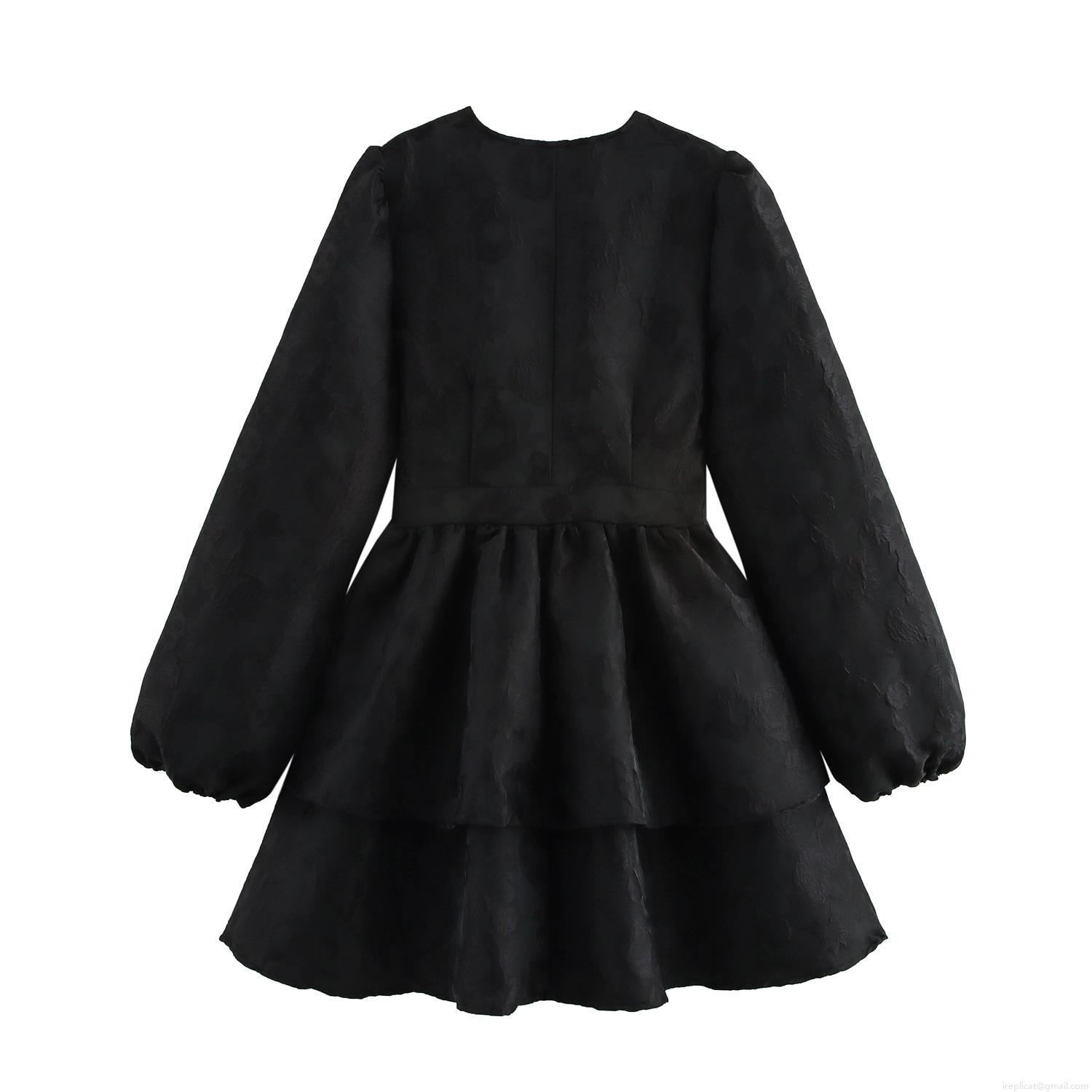 Solid Color, Embossing Process, Puff Sleeves, High-waisted, Floral Jacquard, Deep V-neck, Layered Skirt