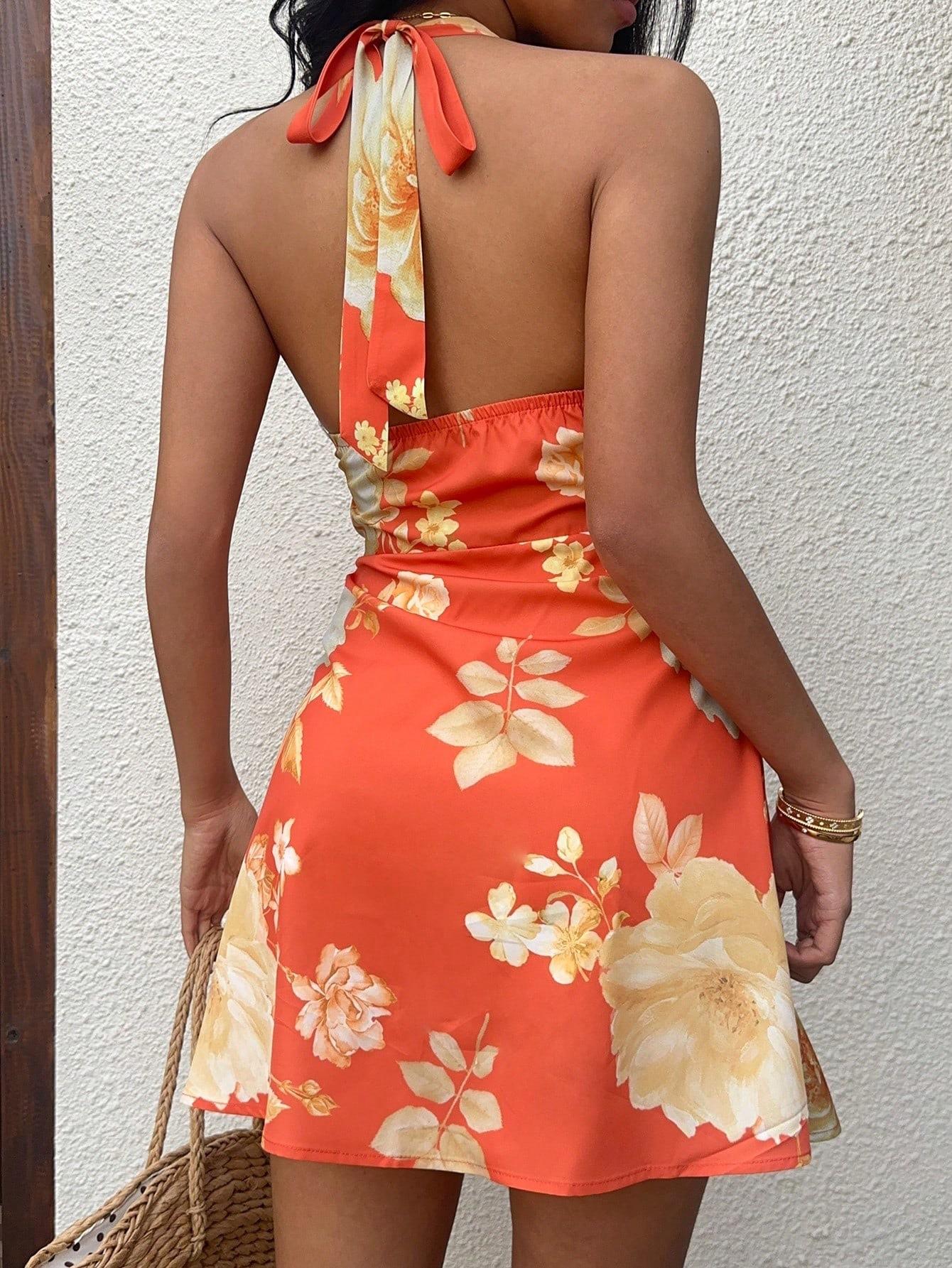 • Elegant Halter Neck Mini Dress Floral Print Polyester Elastane Sleeveless Backless Summer Vacation Short Dress For Women