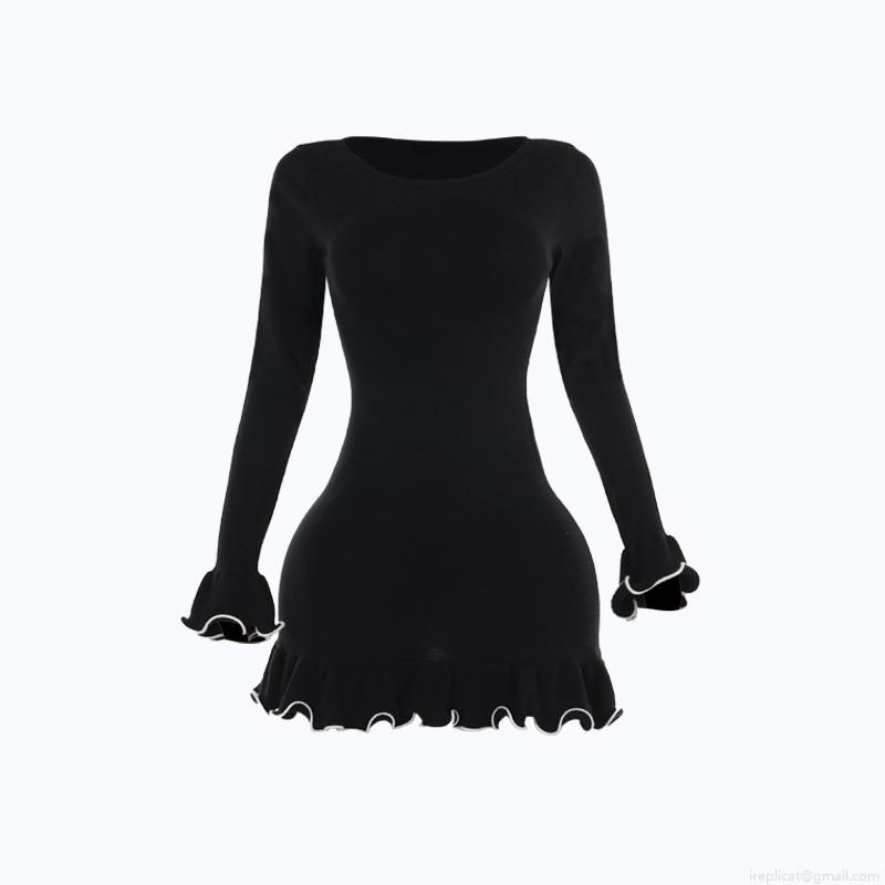Elegant Long Sleeve Knit Mini Dress Contrast Wavy Ruffle Trim Bodycon Fall Winter Dress for Women Chic Party Dating Clubwear Bodycon Dress