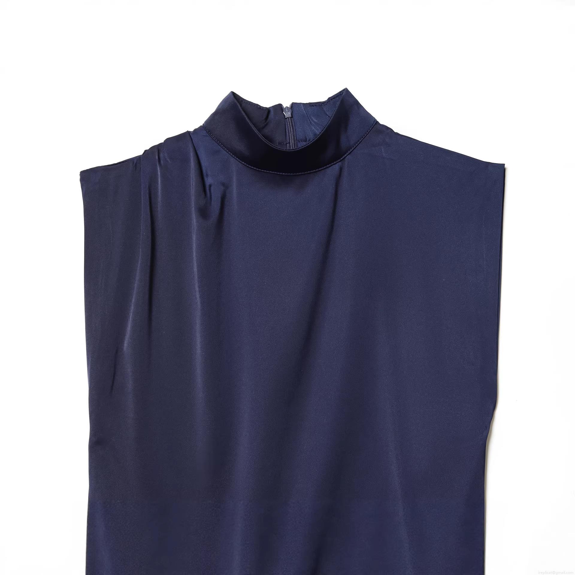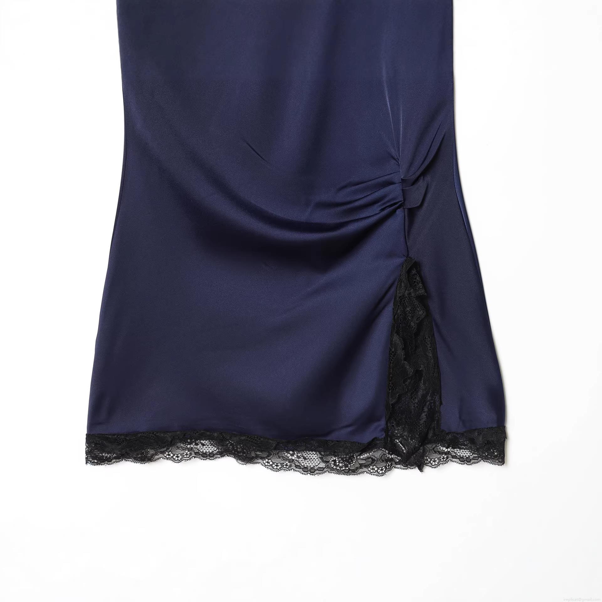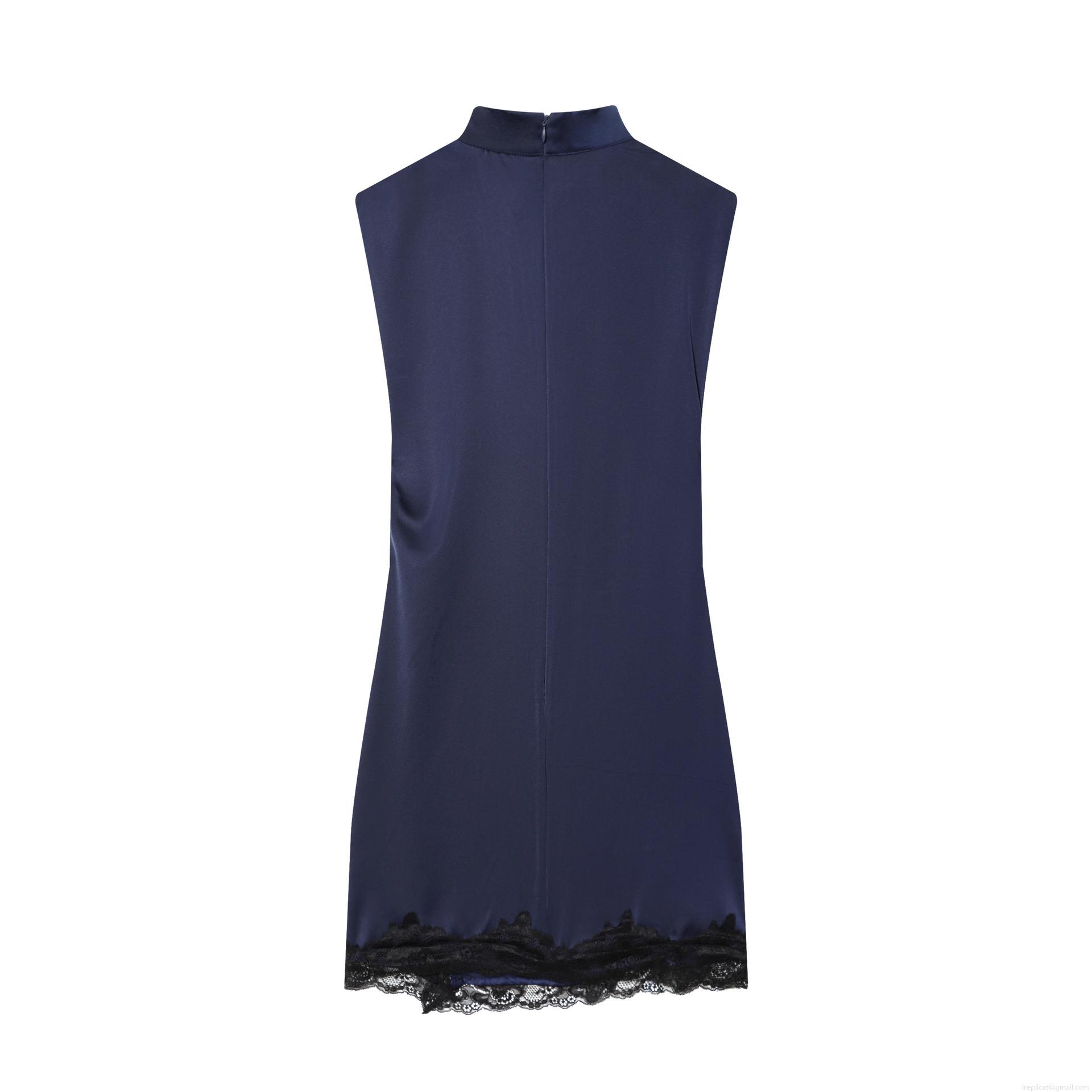 • Elegant Navy Blue Satin Sleeveless High Neck Mini Dress With Black Lace Trim Side Slit Sexy Bodycon Party Cocktail Dress For Women