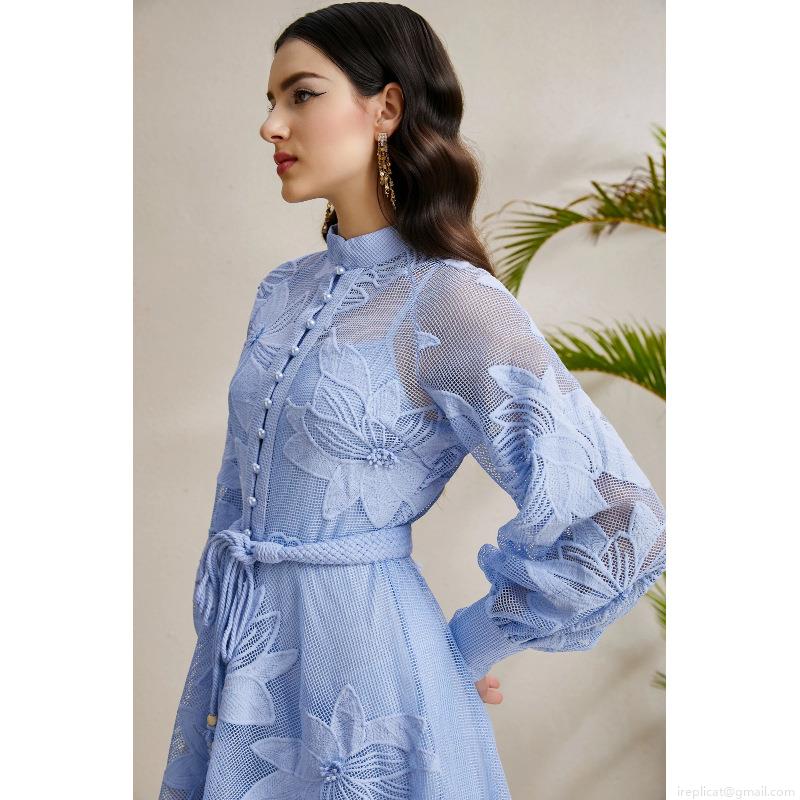 • Elegant Palace Style Floral Lace Mini Dress For Women Stand Collar Puff Long Sleeve Button Front A-Line Party Dress With Waist Tie