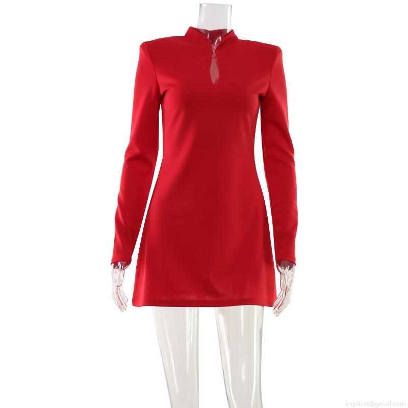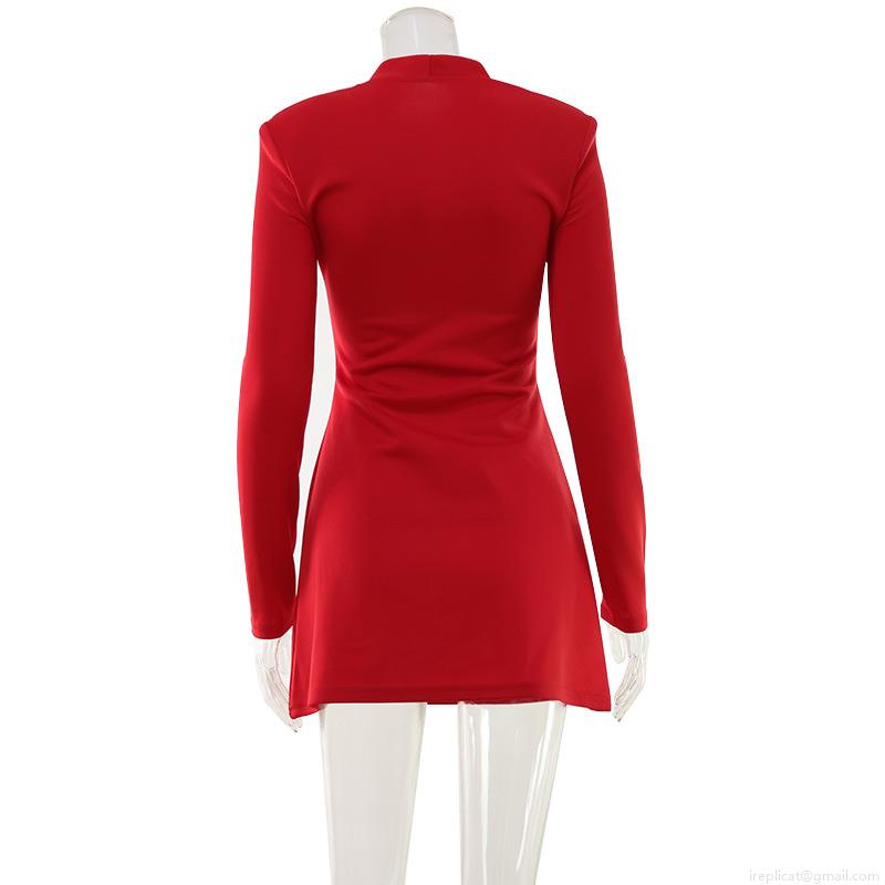 • Elegant Red Polyester Spandex Hollow Out Keyhole Neckline Long Sleeve Mini Dress Slim Fit A-Line Bodycon Party Evening Cocktail Gown For Ladies