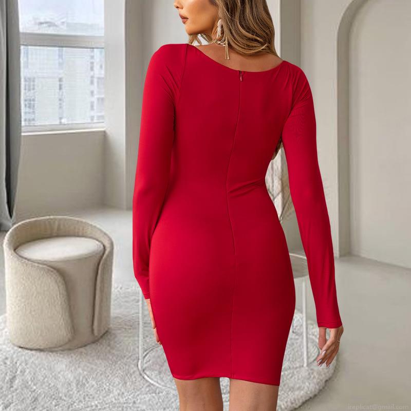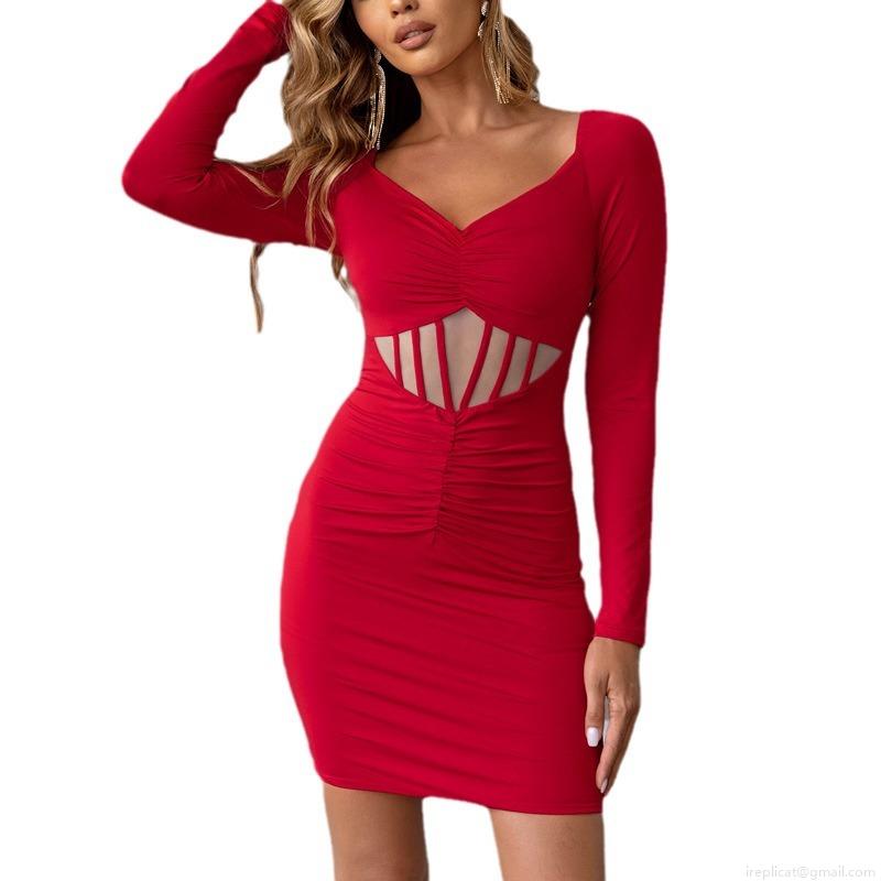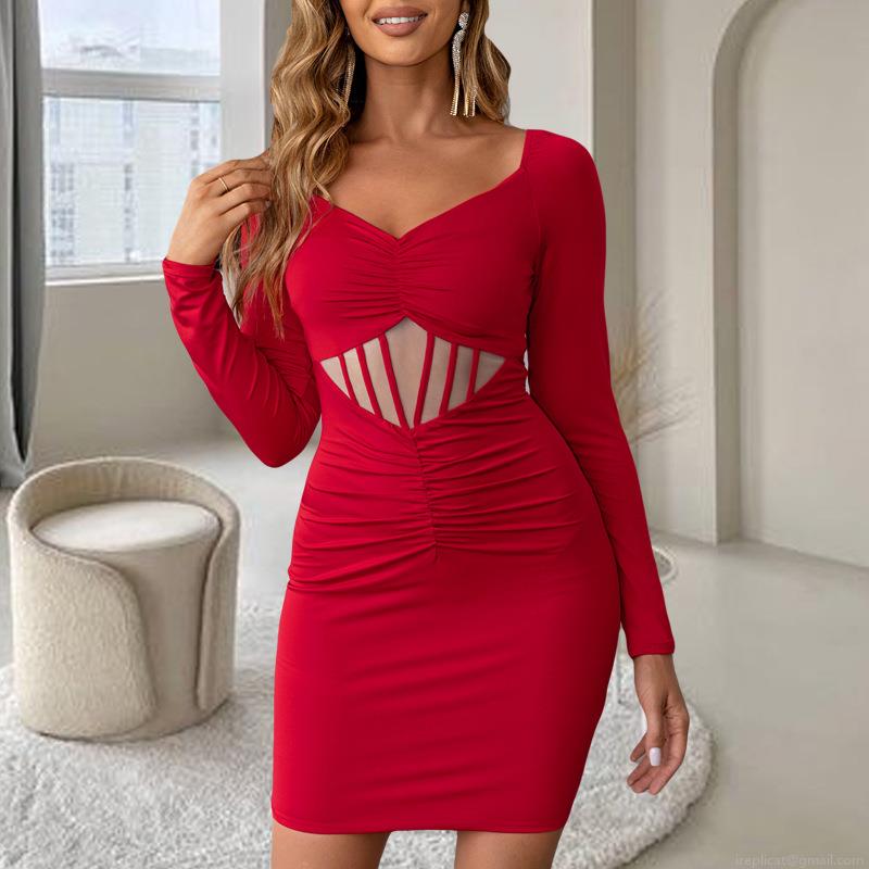 • Elegant Red V Neck Long Sleeve Bodycon Mini Dress For Women Ruched Cut Out Waist Mesh Patchwork Sexy Party Clubwear Dress