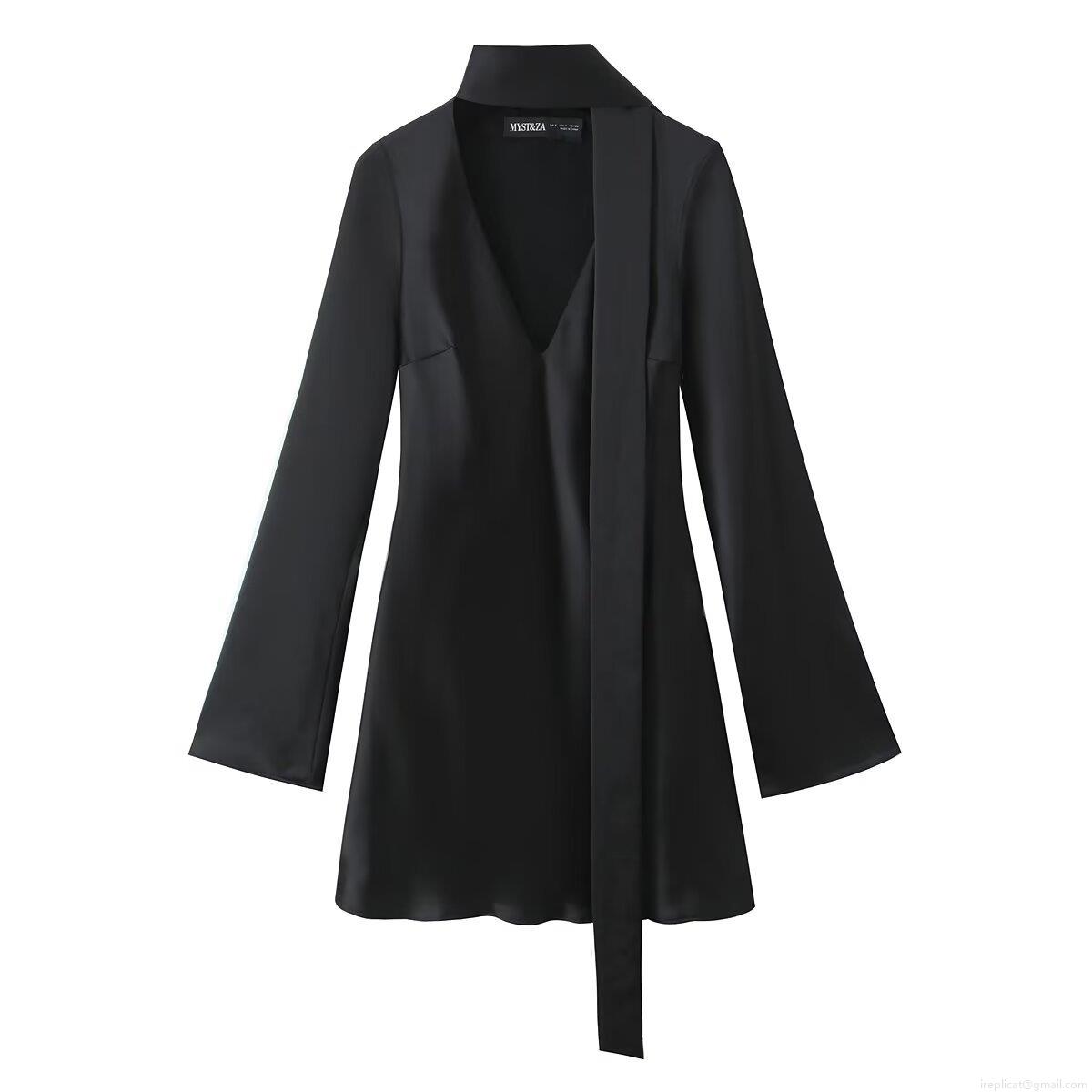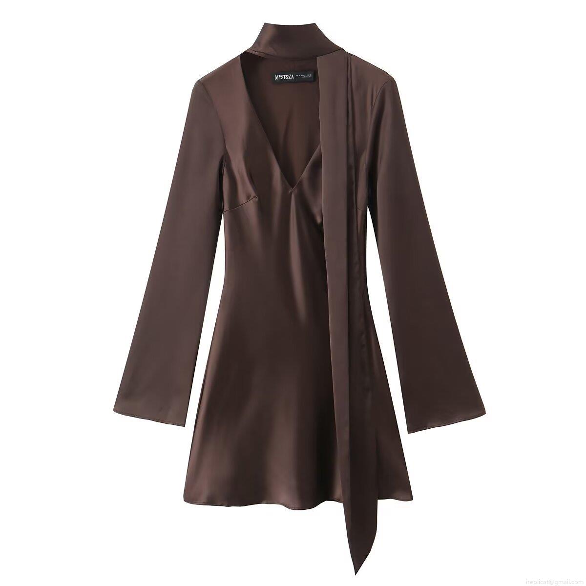 • Elegant Satin Long Sleeve Mini Dress Deep V-Neck Tie-Back Bodycon Party Dress for Women Sexy Silk-Like Solid Color Clubwear Evening Dress