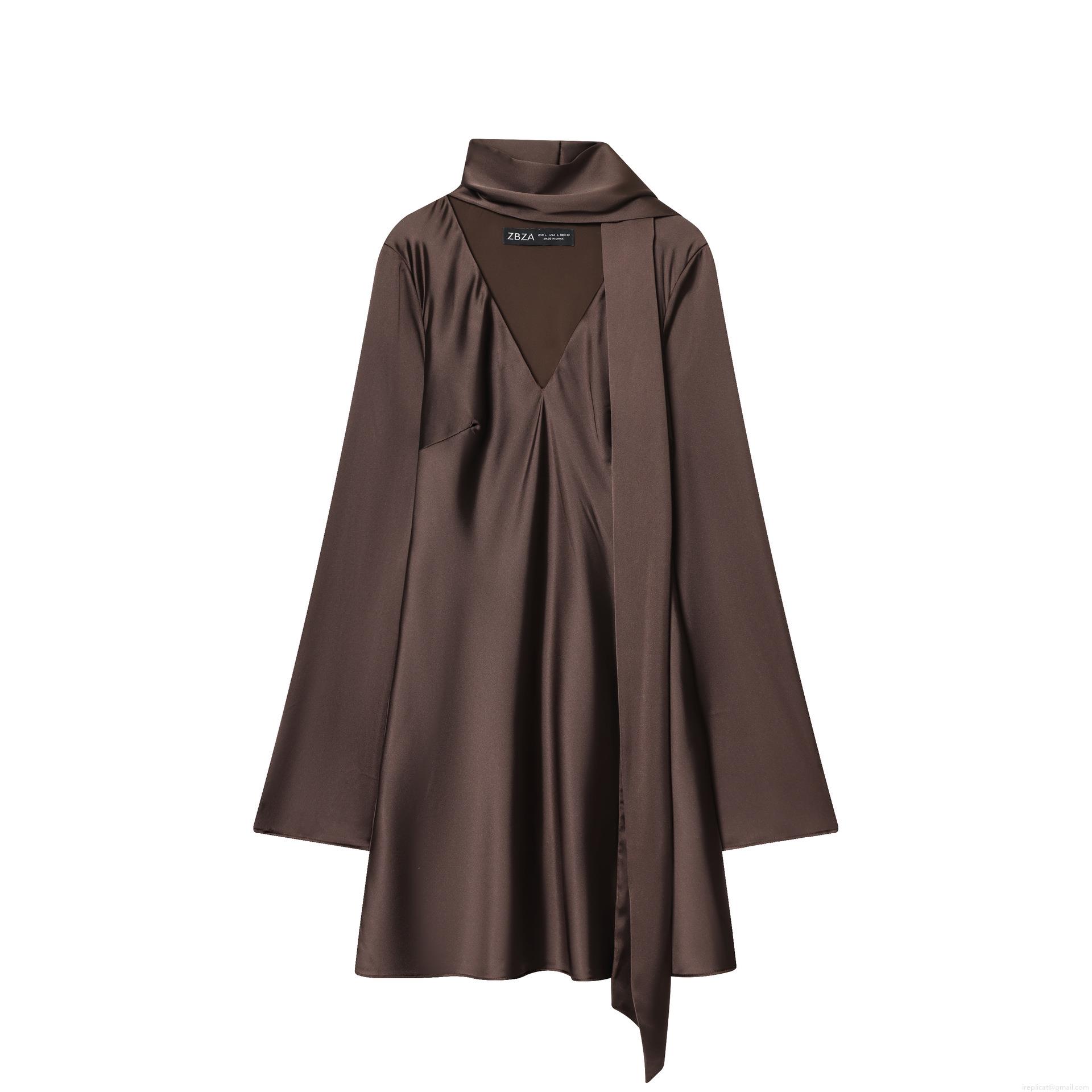 • Elegant Scarf Neck Satin Mini Dress For Women Long Sleeve Flare Sleeve Silk Like Polyester A-Line Party Club Dress Solid Black Coffee