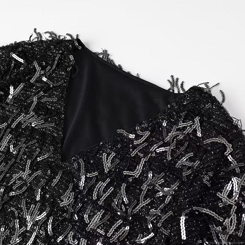 Elegant Sequin Fringe Mini Dress For Women V Neck Long Sleeve Polyester Spandex Slim Fit Bodycon Party Evening Cocktail Glamorous Black Dress