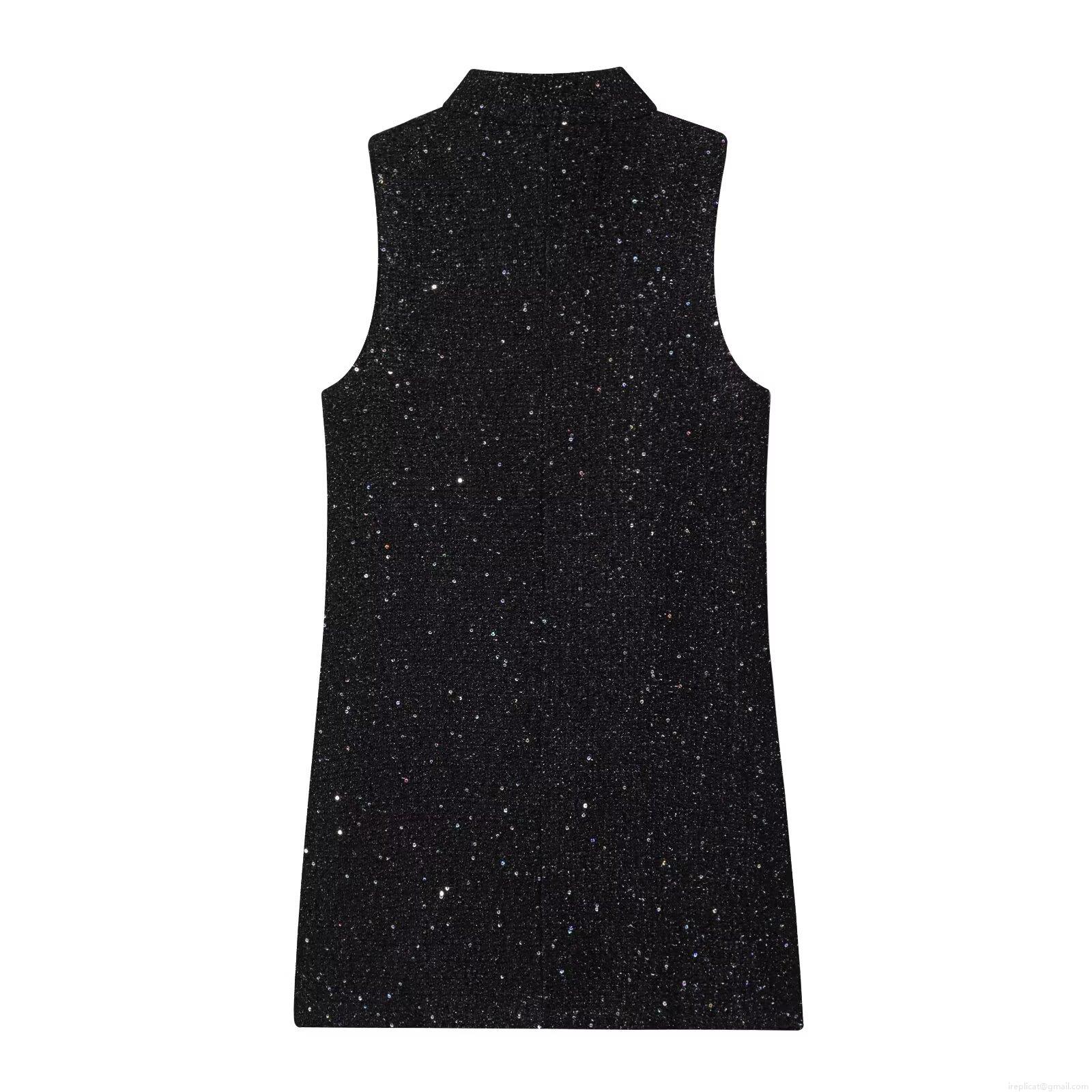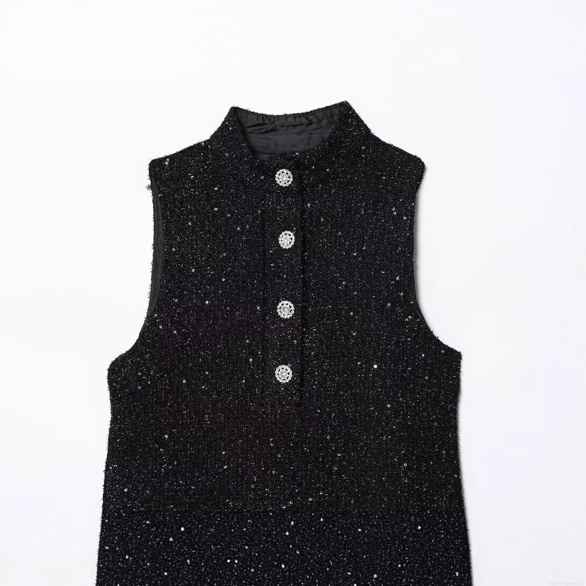 Elegant Sleeveless Bodycon Mini Dress Sequin Tweed Texture Rhinestone Buttons High Neck Party Evening Cocktail For Women Slim Fit Back Zipper