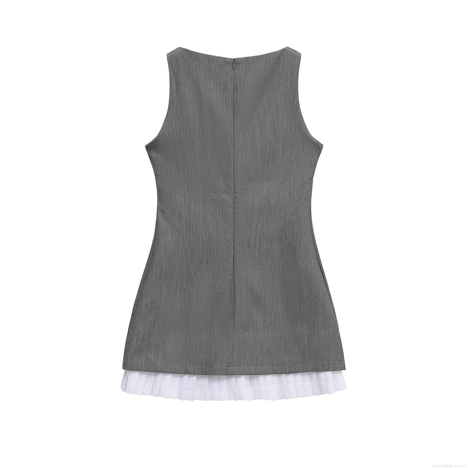 Elegant Sleeveless Mini Dress Women Contrast White Pleated Hem Spliced Round Neck Bodycon Summer Party Short Vest Dress Ladies Polyester