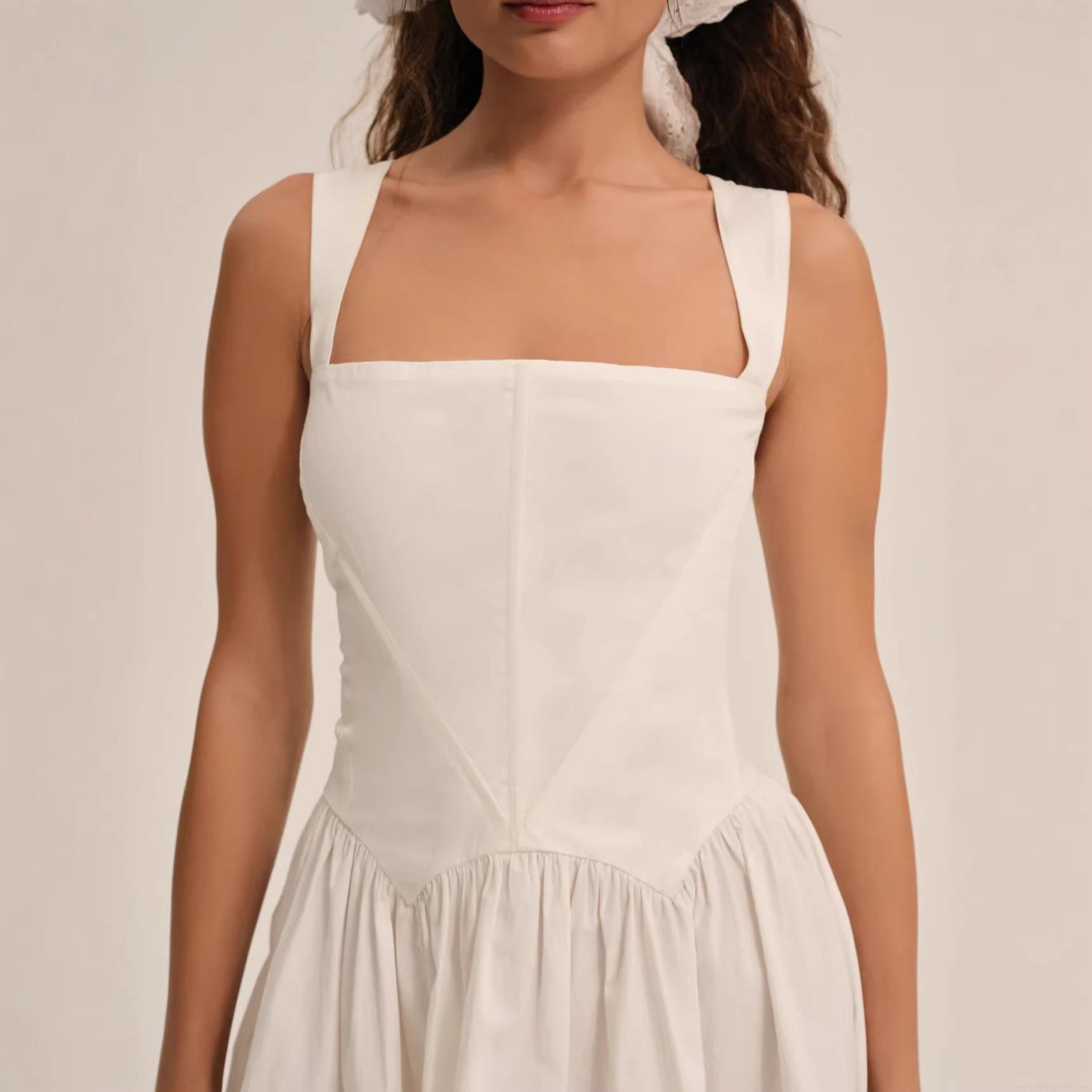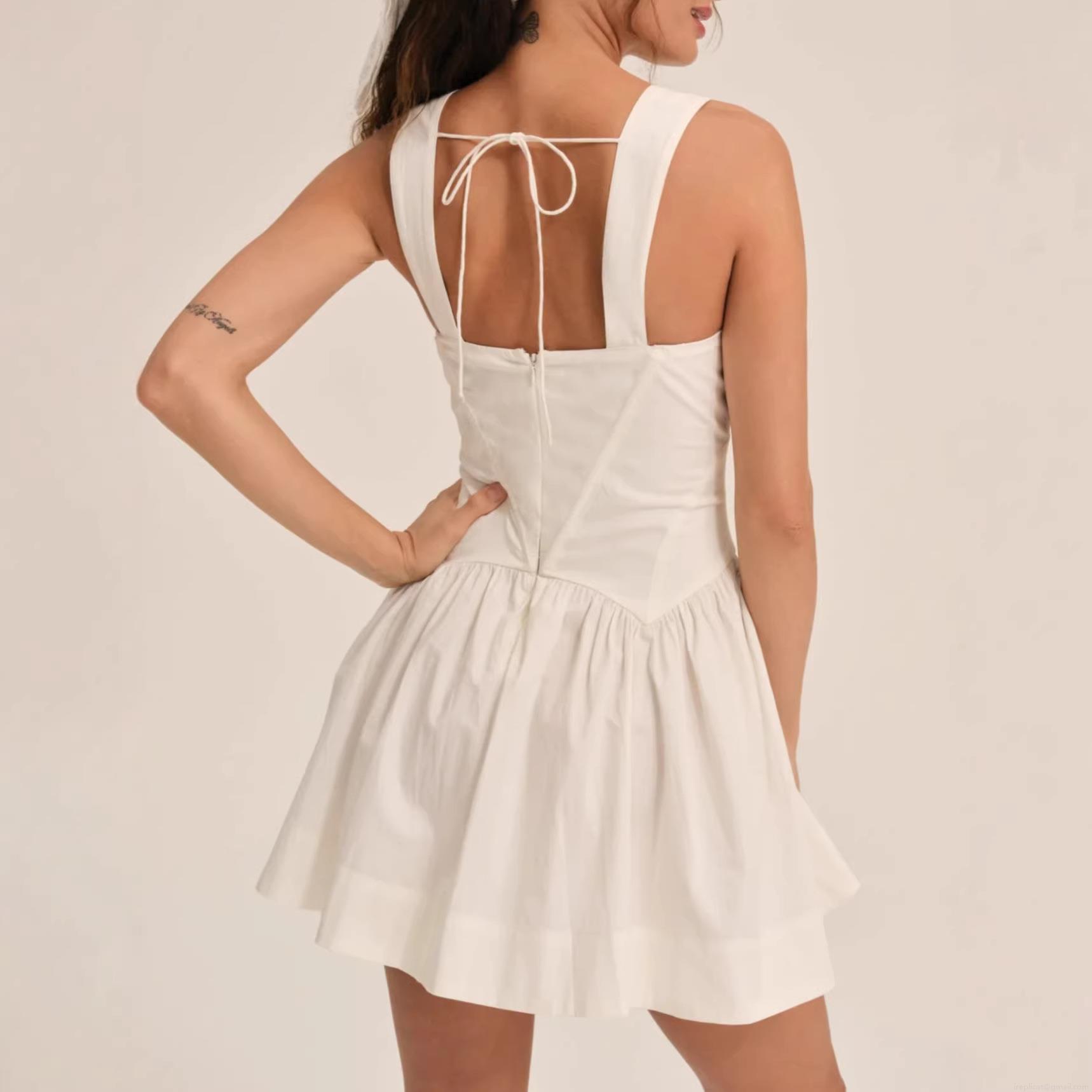 • Elegant Square Neck White Cotton Mini Dress For Women Summer Backless Lace Up Corset Waist Design Pleated A-Line Cami Dress French Style Sexy Party Short Dress